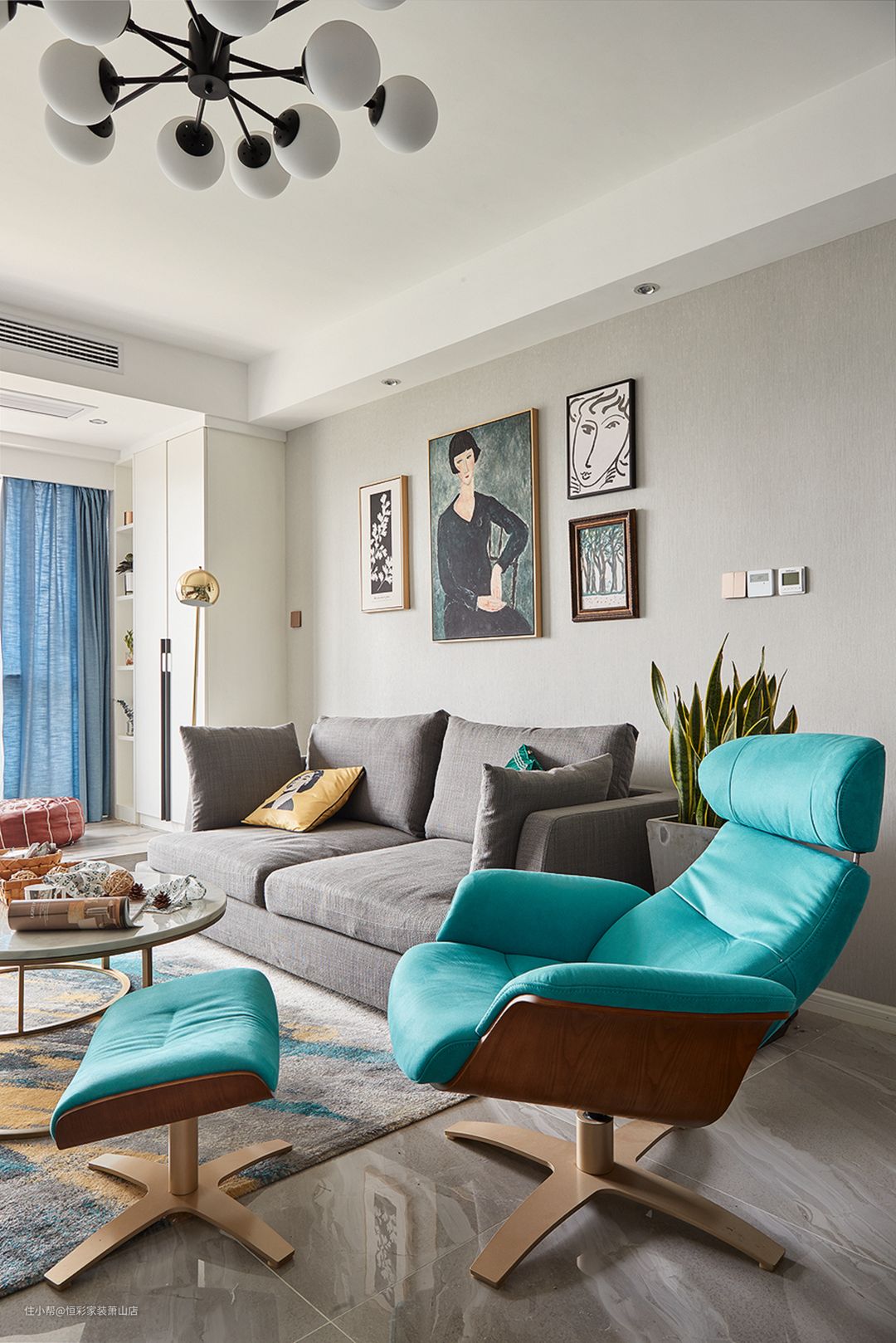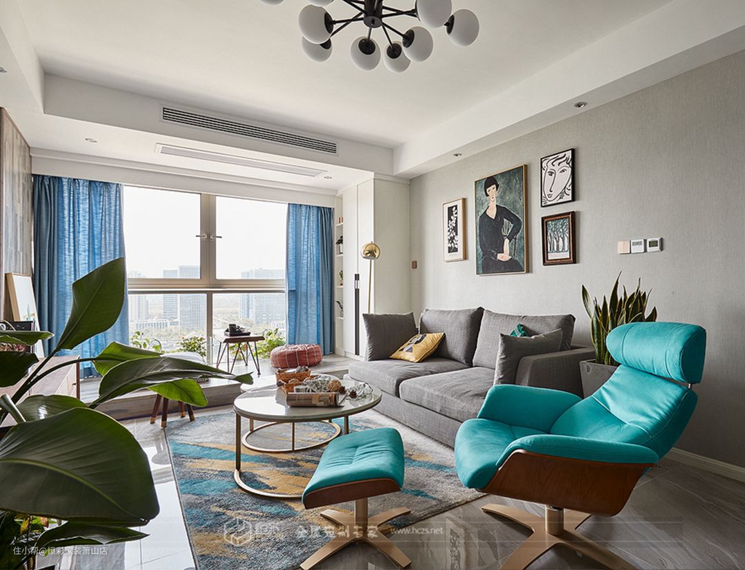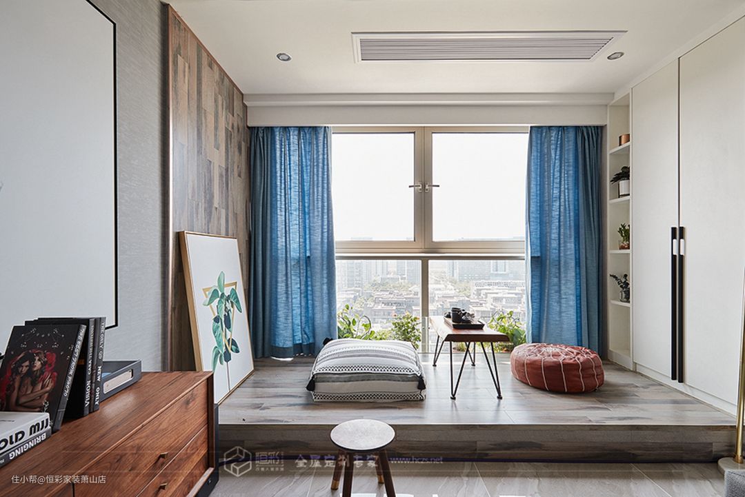 客厅沙发区采用简约的北欧风格装饰,浅灰色的沙发,与挂画、地毯如出一辙的靠垫,祖母绿的单人沙发椅在整个空间起到装饰色的作用,绿植与原木的搭配,自然气息浓烈。高出客厅地面的地台,搭配简单的家具,蓝色的窗帘外,阳光透过落地窗洒进来,加上植物花饰的陪伴,不失为享受下午茶的完美场所。
