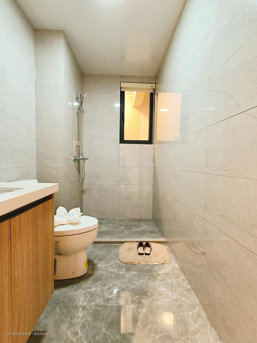 卫生间一字型的布局,简单大方,这样的设计,比较适合小户型。干区与湿区用瓷砖挡水石分离,不会让空间觉得压抑,整体美观度好,不易渗水~高颜值的原木风浴室柜简直实用性满分!双开门收纳柜+侧边开放格,拿取方便的同时还加大了空间收纳!柜子底部是悬空设计,减少了卫生死角,好打理。
