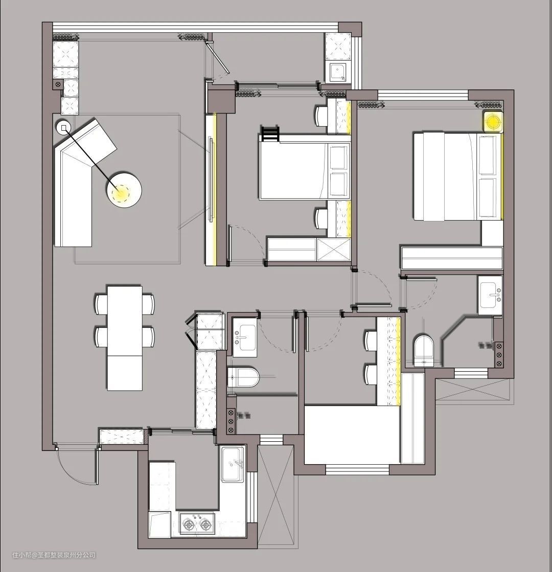 本案主要作为夫妻二人及双胞胎女儿的住处。汪先生和汪太太都是工作狂,因此,家中最好有独立办公区;家有二宝,希望能够形成互动型家居;出于对自然的热爱,空间要多一些天然元素。 ①将远离动区的小次卧为工作室,方便男女主人居家办公。 ②阳台一分为二,一部分规划为家政区,一部分并入客厅,增加室内活动范围。 ③完美运用木质、花束等自然元素,构建出居者偏爱的自然氛围。
