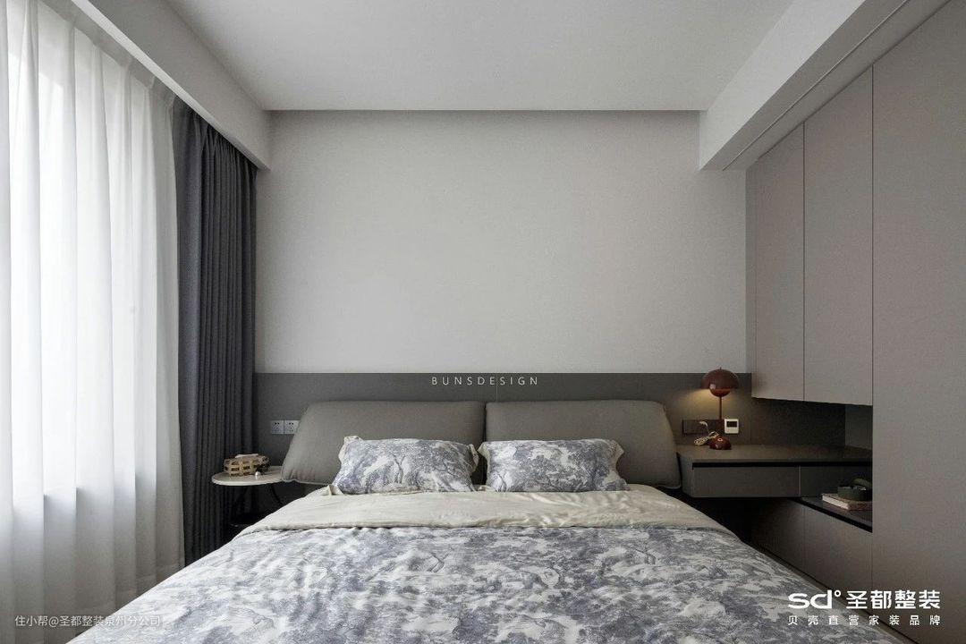 绅士灰席卷了整个空间,完美拿捏低奢调性。一帘白色纱帘轻松隔绝开窗外的喧嚣,成就优雅、恬静的生活方式。 整墙收纳柜容量不容小觑,无拉手柜门更显干净利落;临近床的一侧衍生出悬浮床头柜,不仅前卫时尚,还告别了卫生死角。