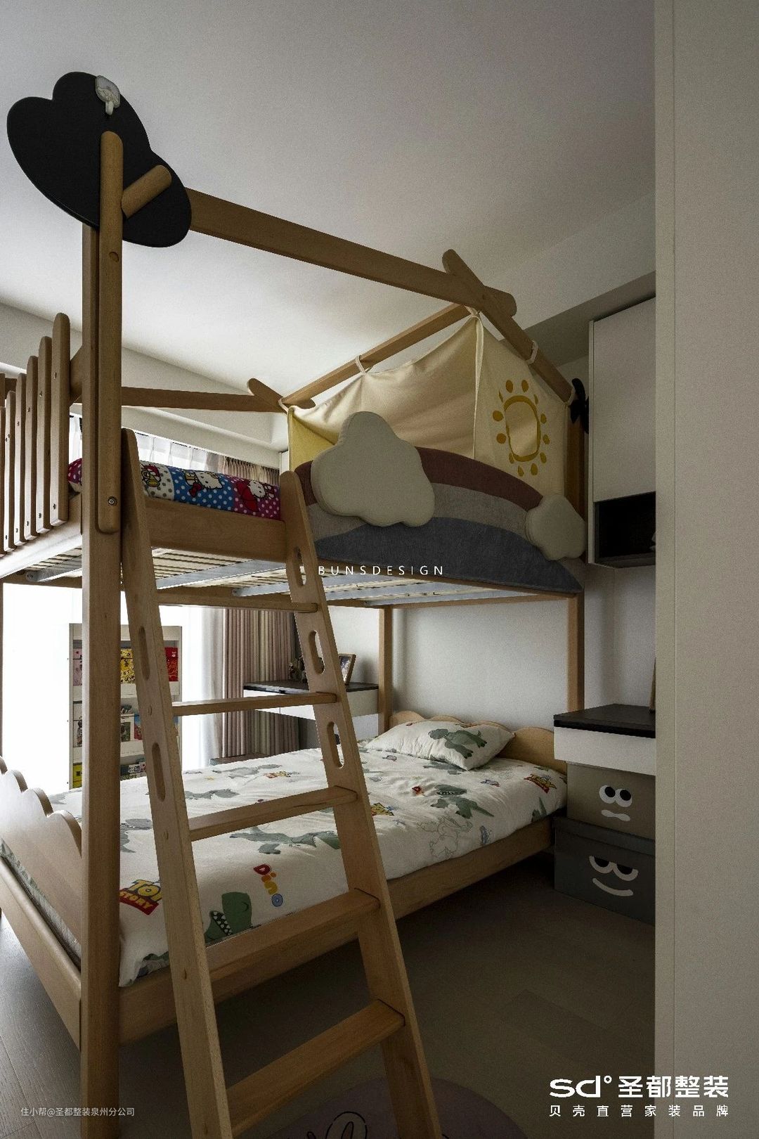 双胞胎女儿亲密无间,不分彼此,索性依了她们想要居于一间的心愿。双层床的设计不会占据过多的空间,毕竟两位小公主正在读幼儿园,平时的书籍与玩具比较多,需要留下充足的空间来收纳。