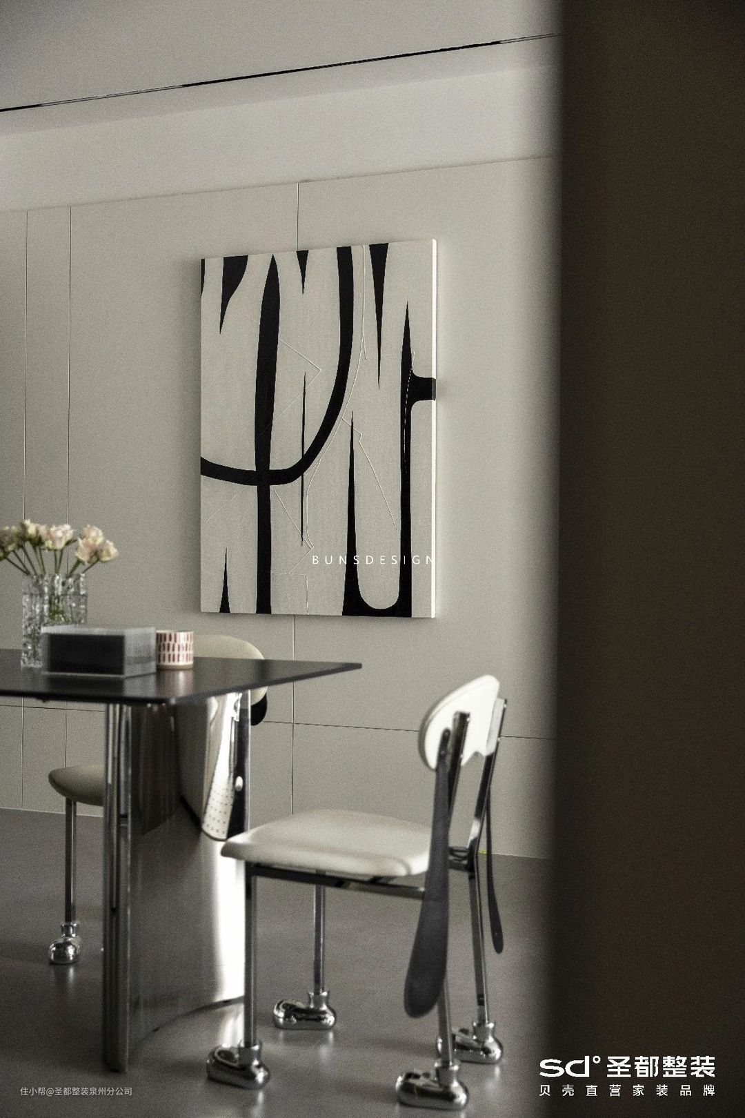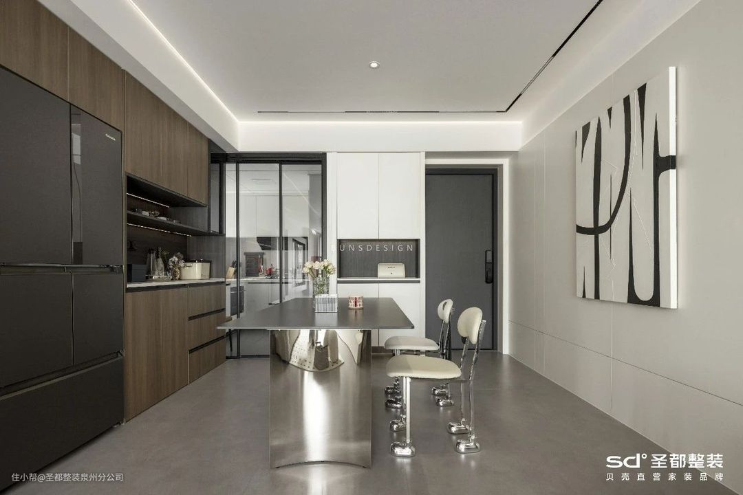 冷峻的金属餐桌隐隐流露出清贵气息,搭配中古风狗狗靠背餐椅,既取悦了两位小公主,又形成一种独特、温馨的用餐氛围。家人闲坐,灯火可亲。四方食事,不过一碗人间烟火。在这方寸之地,优雅与烟火兼具,是日常生活里最朴素的幸福模样。