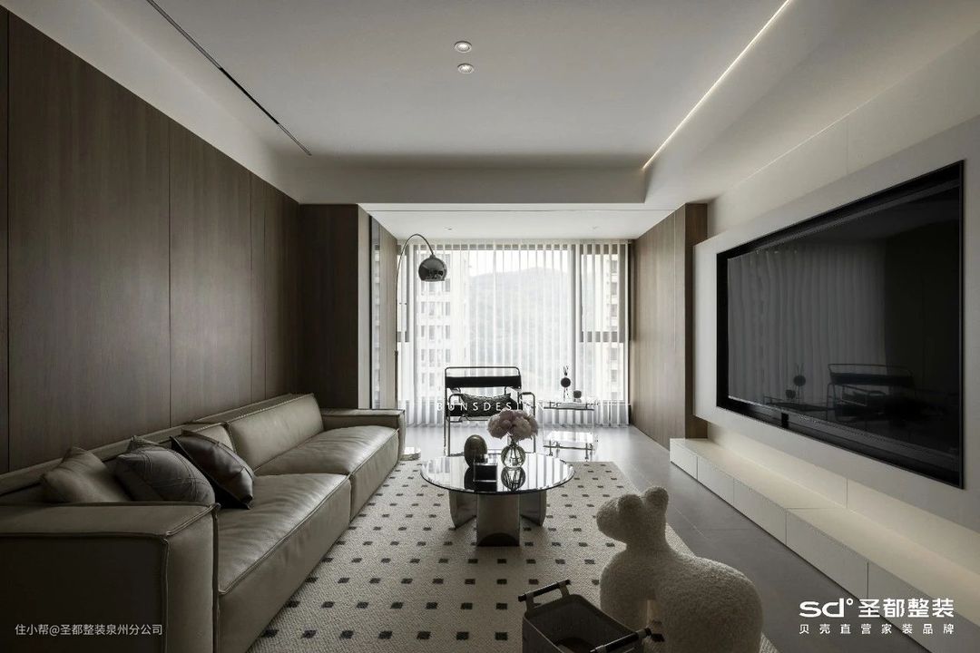 大面积的落地窗展示出最完美的城市风貌,悬一帘竖百叶于此,仿佛给客厅开启一层美颜滤镜。于是,远山与烟波、霁月与清风、温柔与明亮,都能揽入怀中。