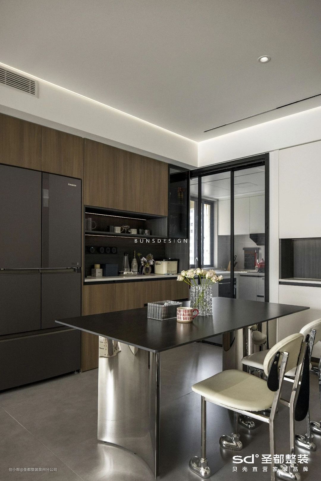 移步到餐厅,浅胡桃木的餐边柜集装饰与收纳为一体:为了缓解小厨房的收纳压力,还将冰箱外移并嵌入餐边柜,实现空间的最大化利用;中部留空形成一个小小的水吧台,进一步拓展餐边柜的功能。