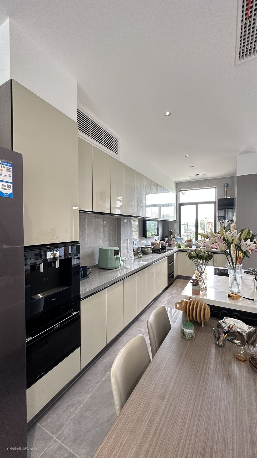 开放式的餐厅厨房,餐桌岛台内嵌入厨电更加方便,使厨房更显得整洁大气。木色的橱柜提供空旷的温馨感。 木制的温馨和白色的纯粹,黑色在其中作为点缀,彼此中和,使空间具有层次感。摆放一些装饰提升空间饱和感,使新房子拥有家的味道。 南北通透的空间也带来良好的通风效果,整个空间非常的通透,采光也非常好,明亮的空间给人带来阳光。