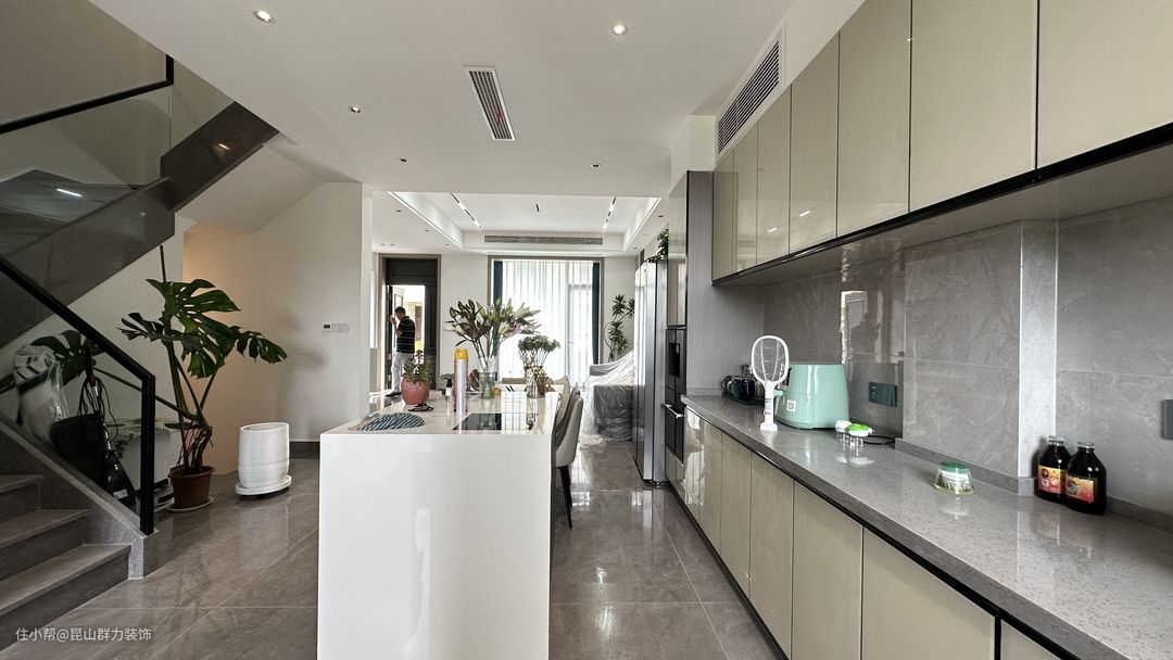 客厅的一侧是开放式的厨房,整个空间现代实用而且时尚高级。色调的搭配简洁且充满个性,充满现代简约的实用主义的风格。 简洁的设计,日常生活中方便打扫,设计与生活相统一,岛台和餐桌的设计不仅美观,日常使用中更加方便。 所有的厨房设备应有尽有,嵌入式的厨房电器便于方便,使厨房更显得整洁大气。