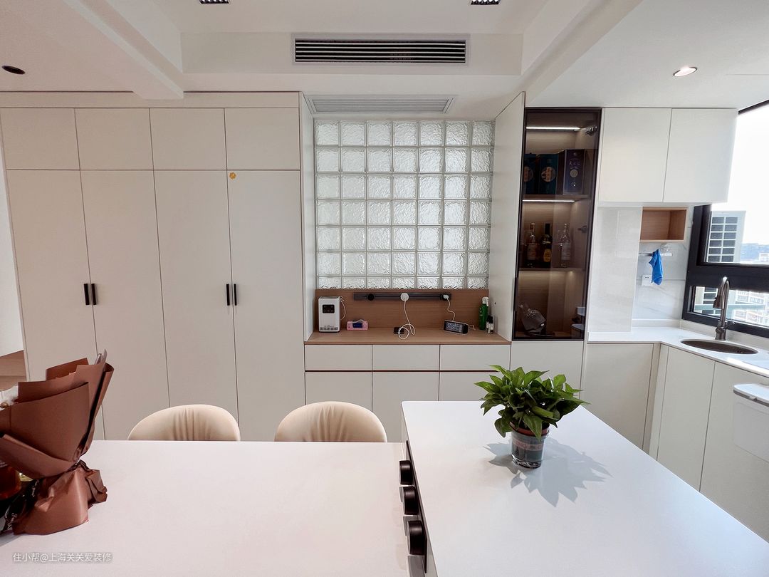 改造前: ❶风格过时、设施老破:本案业主一家已经居住了长达20年之久,软硬装和设施陈旧,房屋布局使用功能不全; ❷功能区域面积不合理:阳台闲置、主卧、客厅、卫生间的空间都太小,舒适度大打折扣; ❸收纳空间紧张,室内杂乱:生活用品和杂物都只能靠墙堆放,采光和通风也受到影响; ❹卫生间干湿合一,潮湿不便:湿区和干区共处一室,洗澡时四溅的水花让整个空间湿度很大,影响使用。 改造后: ❶选用现代简约风,温馨雅致经典耐看,改动格局、优化动线、贴合一家人的生活方式; ❷功能区域合理划分:将原先闲置的阳台调整为西厨简餐区,由一厨升级为双厨;通过打通阳台实现客厅面积扩容的目的; ❸定制柜体,收纳空间翻倍:定制整面墙的收纳柜,餐厅靠墙增设组合餐边柜,卧室配置L型衣柜,收纳衣物; ❹一卫改两卫,干湿区分离:中间使用长虹玻璃隔断,透光不透人,大大提高了使用效率。