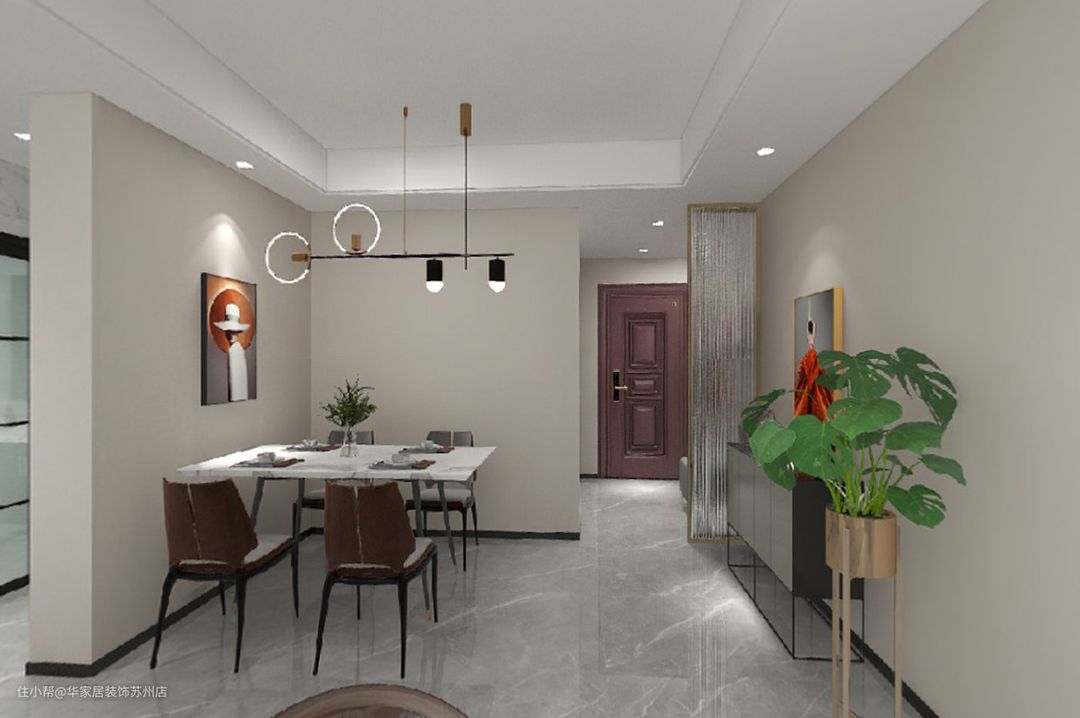 【方案细化】 1、取消传统门套和门槛石,室内所有边框尽可能简洁,客餐厅空间开阔明朗。 2、功能需求性较强,一卫改两卫,取消传统门套和门槛石,室内所有边框尽可能简洁,客餐厅空间开阔明朗。 3、让公共区域得到多方向的延展,最大化采光通风,利用柜体处理原户型缺陷,增加收纳空间的同时让室内空间更加规整有序。