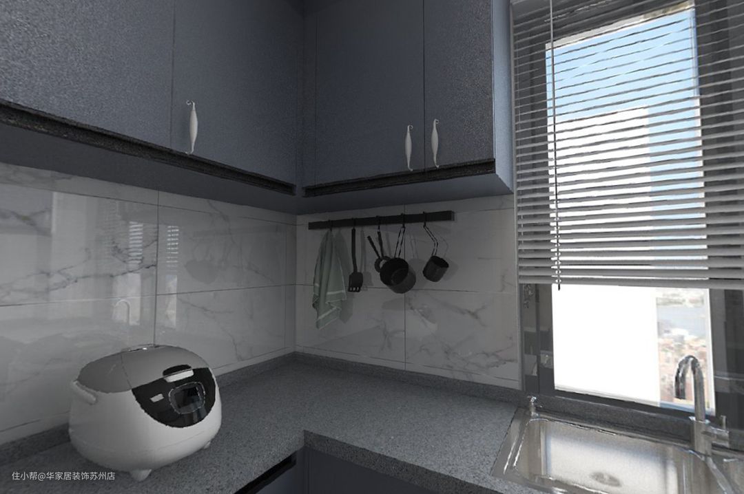 U型厨房设计,更加符合人体工学,环形台面更加美观实用,提高厨房空间利用率。 厨房窗帘选择镁铝合金百叶帘,具有防腐、防水、遮挡视线、易清洗的功能。 采用透明玻璃移门,在有效隔离厨房油烟的同时还能增加厨房采光。