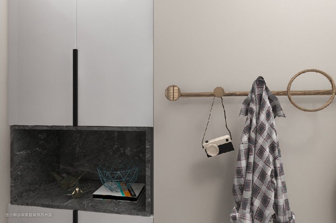 玄关处定制入墙式玄关柜,中间留空用来放钥匙纸巾等小物件,柜子不落地,以悬空设计增加空间美感,也方便换鞋和打扫卫生。 在墙面安装艺术挂钩,提高生活便利性。运用格栅、长虹玻璃来装饰墙面,起到隔断、美化空间的作用。