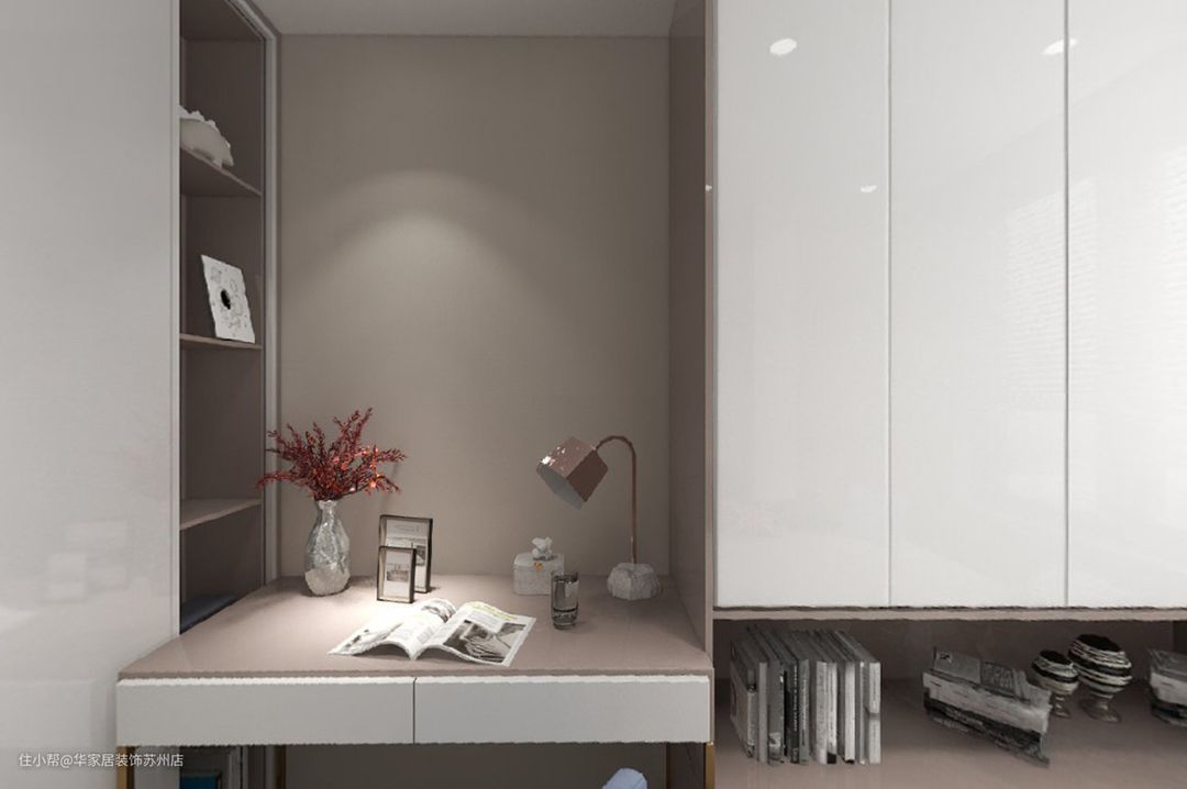 整个榻榻米采用极简奶油风格,满足书桌、书架、衣柜床铺等功能需求,充分利用空间。 床头处设计一体式书桌书架,床铺上方打造一组吊柜,满足日常衣物收纳需求,中间镂空可用来放置日常书籍。