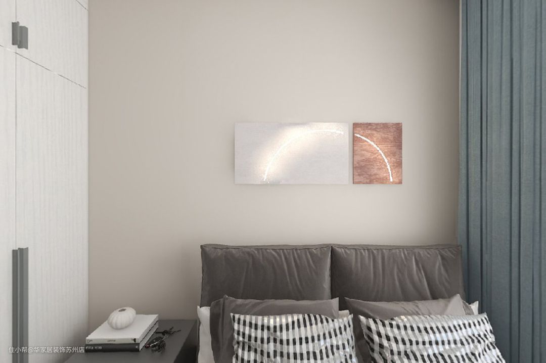 次卧定制原木色衣柜,木地板营造出卧室的温暖感,飘窗上方铺设软垫,也可看看窗外景观,舒适感满满。 床头的装饰画让背景墙显得不那么单调,更好的融入空间,不显突兀。