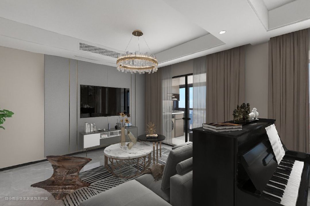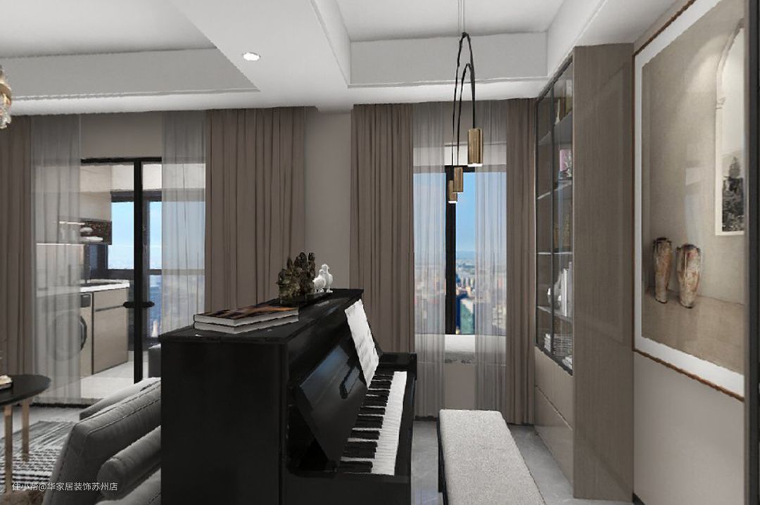 浅黄色渲染明亮氛围,家具用深色来搭配,拿捏得当的色彩搭配所带来的现代设计感,不仅让客厅空间更显宽敞通透,还大大提升了空间质感。 沙发背后的区域可视为开放式琴房,摆放一架钢琴。其后是原木色的到顶收纳柜,视觉上也拉伸了空间高度,既独立又统一。