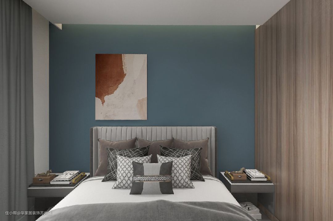 随动线进入卧室空间,氛围逐渐趋向平和。床头背景墙通刷深蓝色乳胶漆,搭配艺术画,妙趣横生。 衣帽间置顶衣柜背面作为卧室的隔断,去繁求简,没有强烈的要素碰撞,只留下家的自然宁静。 将主卧窗台做成大飘窗,可以卧坐于此赏景发呆,其下也可以收纳杂物。