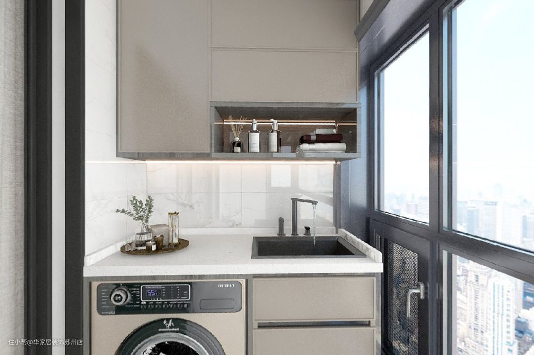 阳台一侧作为洗衣角,定制地柜与吊柜,将洗衣机内嵌其中,增加阳台空间平整性。 吊柜四开门下面设计一层开放格➕毛巾架,挂毛巾,晾衣架,肥皂等都很方便。