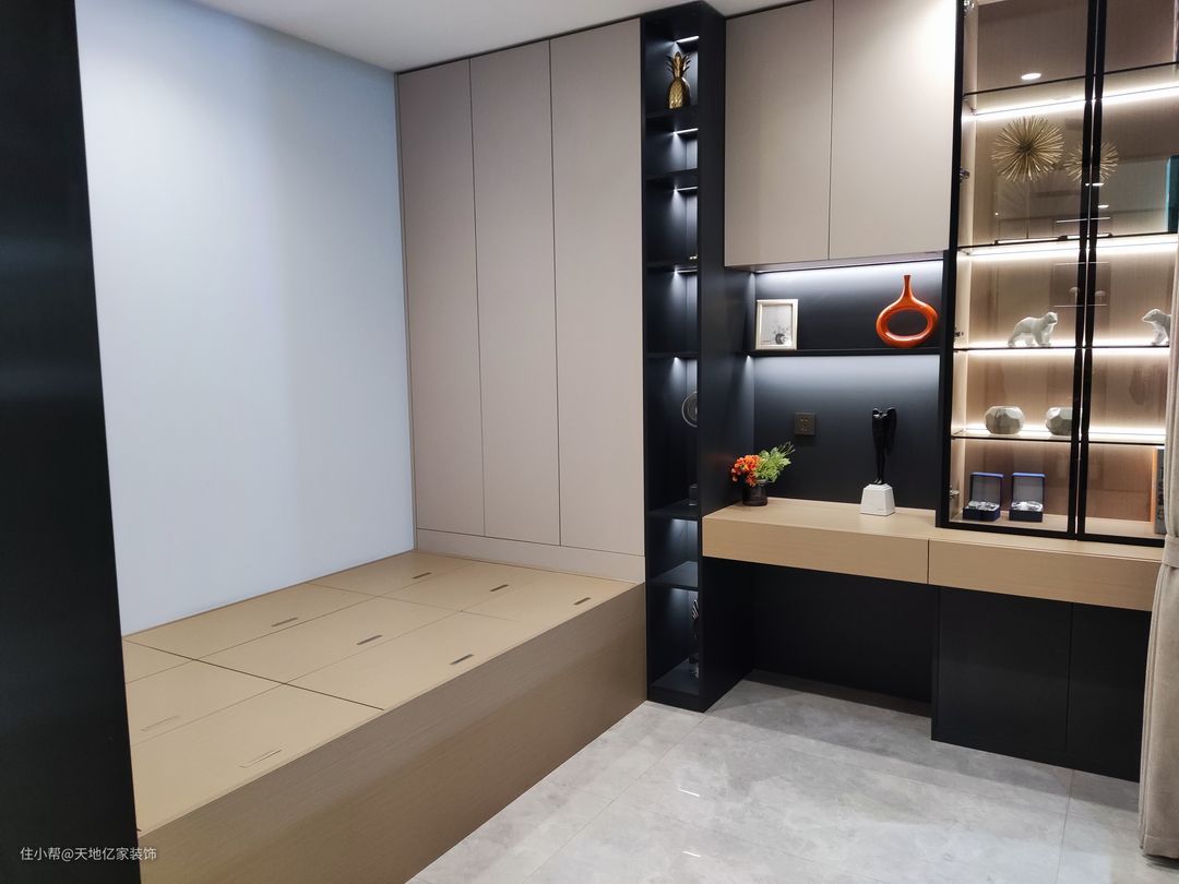 次卧做了榻榻米和书桌一体设计,榻榻米是小卧室想增加收纳比较实用方法,能尽可能扩大空间利用率,满足多种需求。