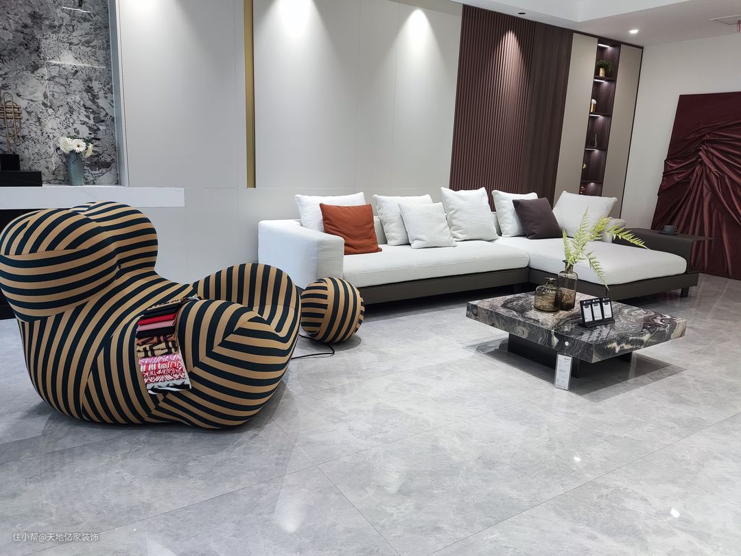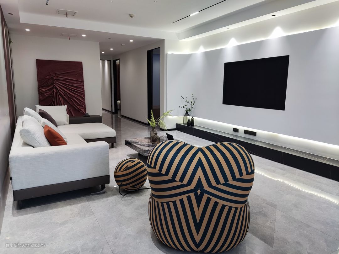现代简约在于轻装修,重装饰,整体通刷的大白,没刷其他颜色乳胶漆,比较百搭,地砖选了灰色地砖,实用耐脏,电视背景墙用石膏板做了设计,显得客厅空间有设计感。