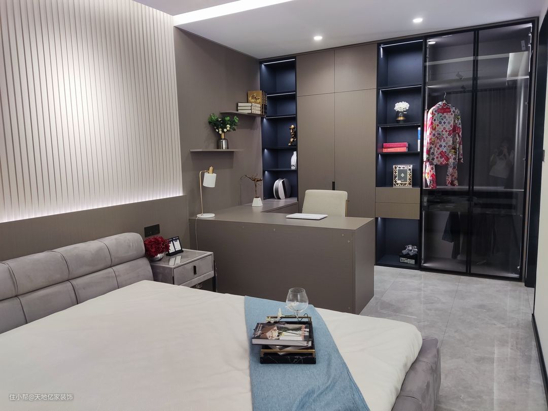 业主想要一个能在家办公的场所,设计师将主卧整体色调设计为灰咖色,比较高级,低饱和度更适合睡眠环境,将书房并入到卧室空间,扩大空间利用率,还增加了卧室多功能性。