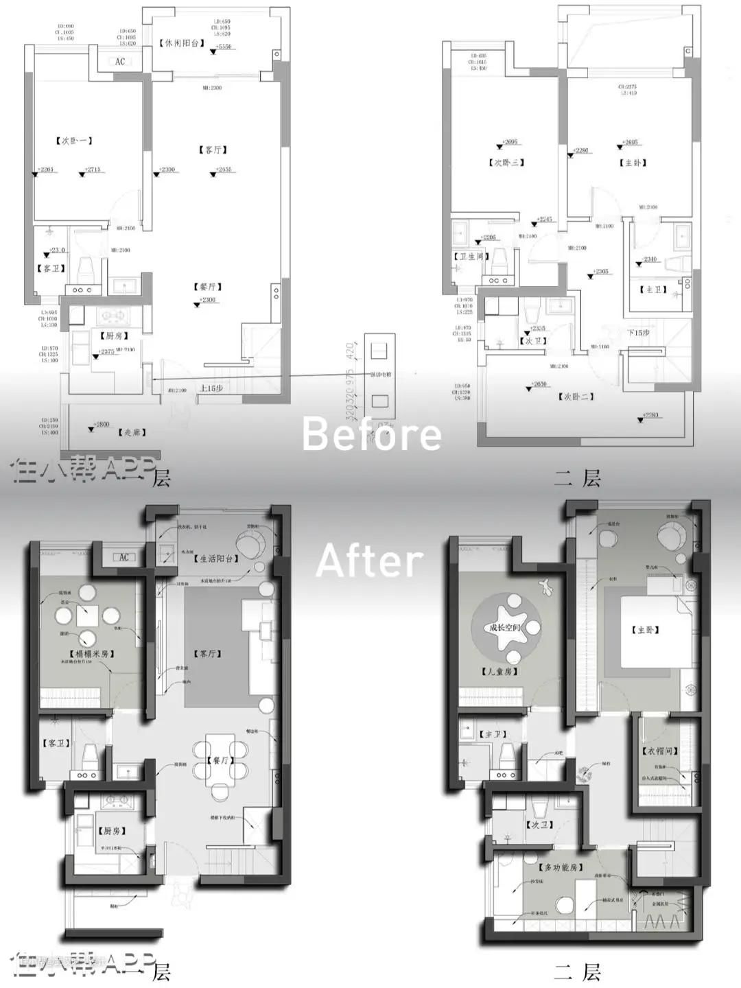 · 靠边户型的优势,屋外的闲置过道设计一个简单的鞋柜收纳 · 室内阳台增加收纳柜和休闲区,室外阳台增加遮阳棚 · 主卧将原有卫生间改为衣帽间 · 喜欢投影的两个人,2楼的书房可看书可观影 · 冰箱放在餐厅,增加餐边柜