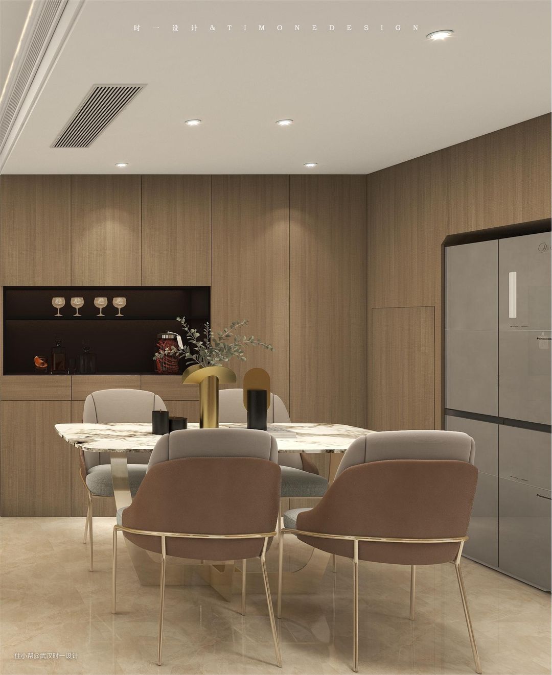 餐厨空间比较小,餐厅靠近楼梯设备间,利用空间受到了限制,厨房放不下的冰箱就理所应当的在这里出现,嵌入式严丝合缝的设计,既让厨房空间得到了解放,也让餐厅使用起来更加方便,在餐边柜的选择上,选择与客厅一致的原木,整个护墙板从餐厅延伸到了公区整个空间,整体性真的做到了极致