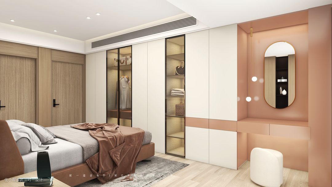 房间的收纳应该是达到了极致,连卫生间都改造成了衣帽间,因为二楼有足够多的卫生间就选择了这样的设计,新家为数不多的粉色梳妆台是女业主的专属位置,大大的落地窗搭配休闲区,拆掉的阳台才有了它的价值