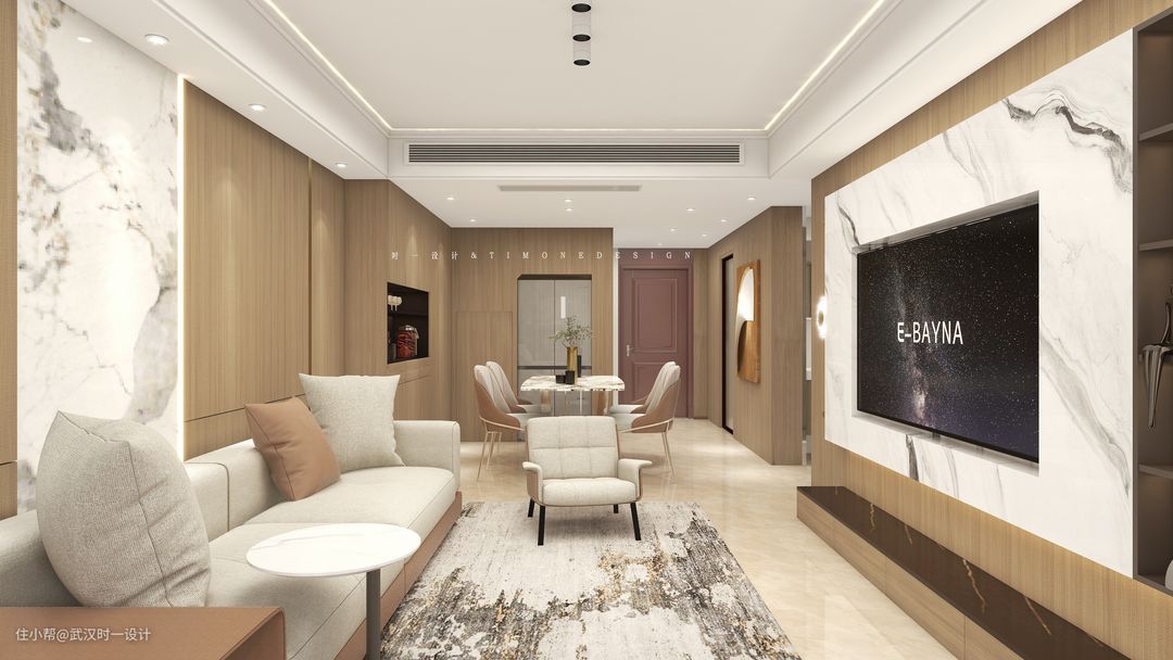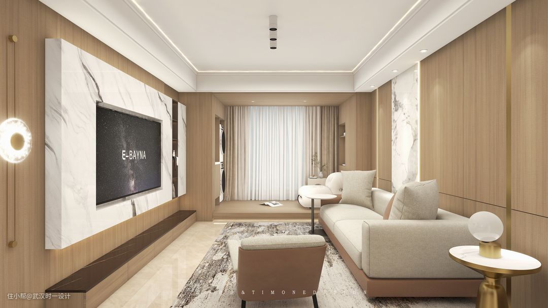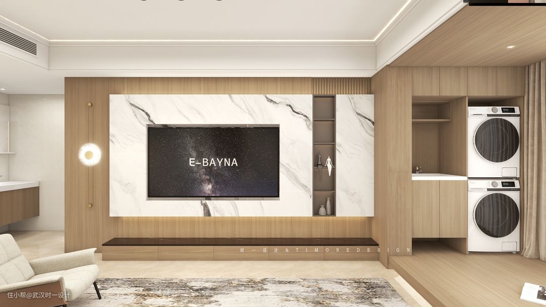 设计师将原有客厅与阳台的门拆除部分,整个推拉门往外移动到与室外的连接,尽可能的使科通等空间显得更大,室外还有一个休闲阳台,遮阳棚就起到了很重要的作用,抬高的木质地台又不自觉的划出了一个兼具生活与休闲的阳台,隐藏起来的晾衣区,也让男屋主在客厅的时间很舒适 电视背景墙选择仿石纹面板,是屋主喜欢的石材与木材的碰撞 △电视背景墙突出部分:6㎡木制作基层,在墙面打孔钉入楔,OSB板