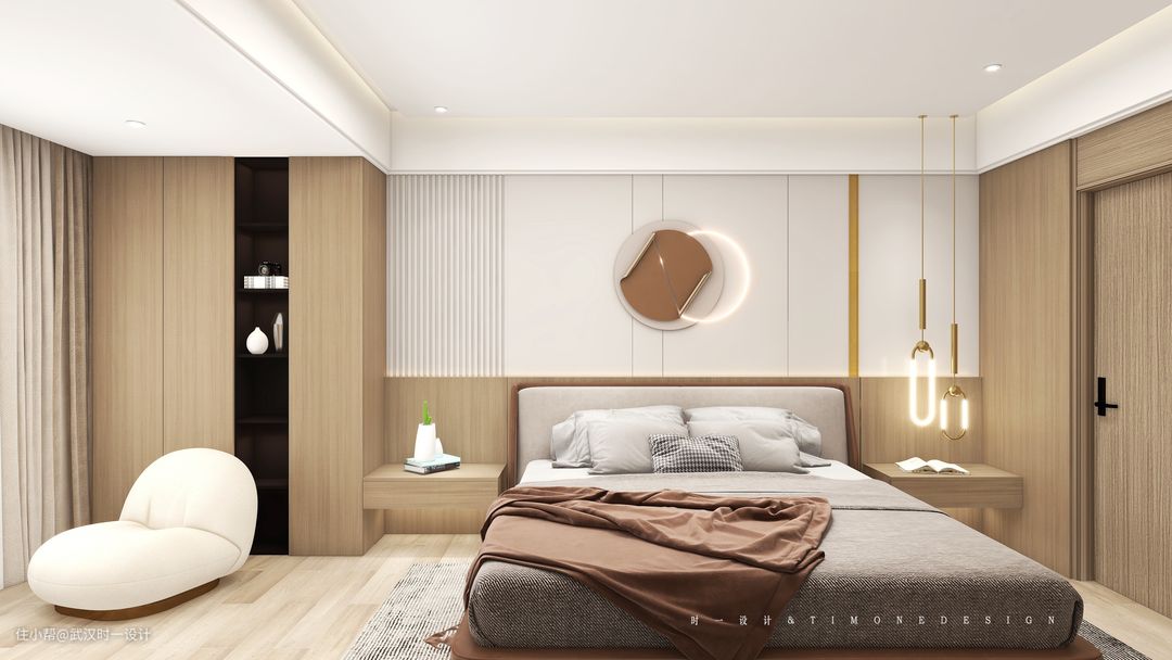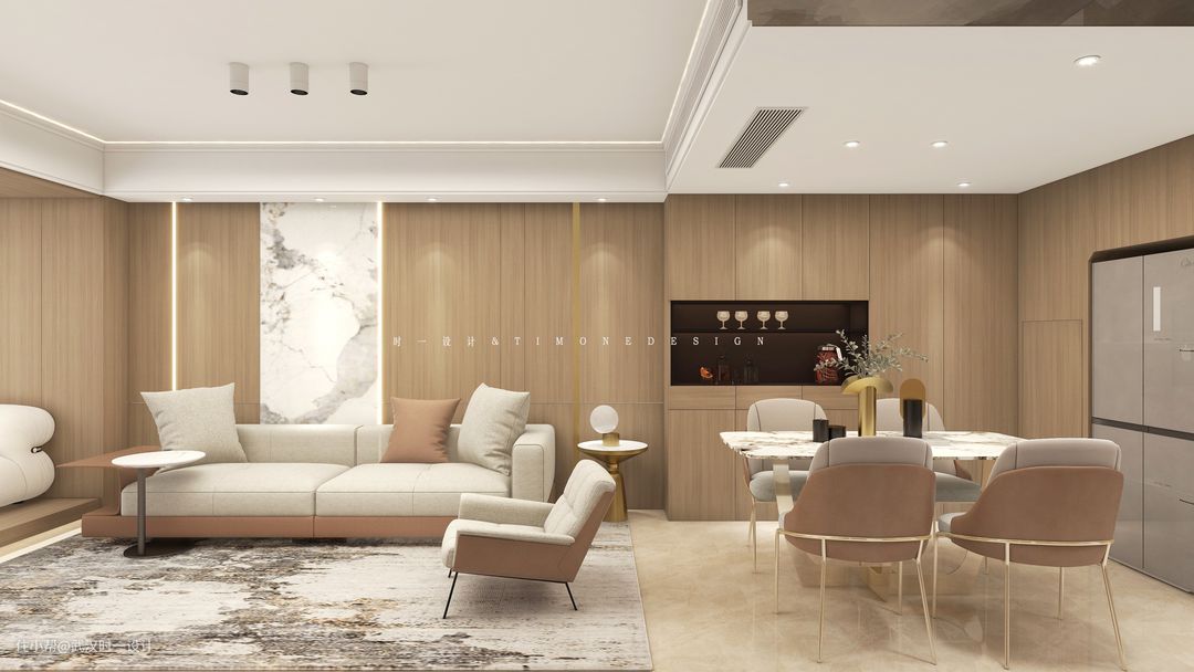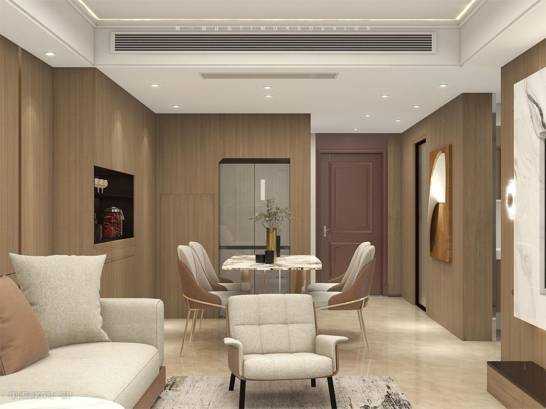 餐厨空间比较小,餐厅靠近楼梯设备间,利用空间受到了限制,厨房放不下的冰箱就理所应当的在这里出现,嵌入式严丝合缝的设计,既让厨房空间得到了解放,也让餐厅使用起来更加方便,在餐边柜的选择上,选择与客厅一致的原木,整个护墙板从餐厅延伸到了公区整个空间,整体性真的做到了极致