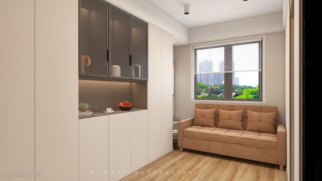 看书和观影都能在这里解决了,百叶帘设计恰到好处,靠墙设计一整面收纳柜,一侧是沙发,一侧是投影幕布,更想不到的是,这里居然有卫生间,实在是有点便利