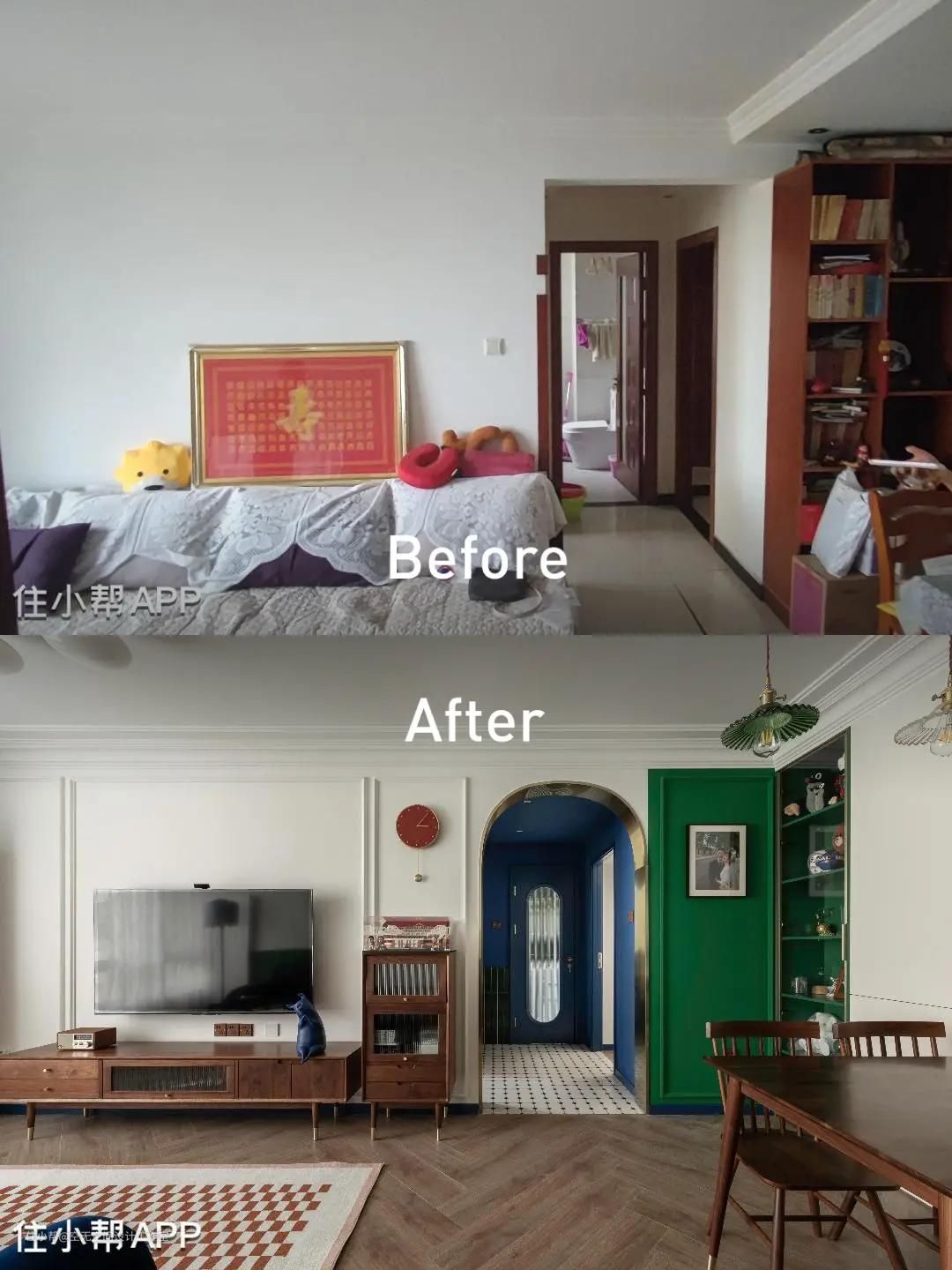 【客厅改造前和改造后对比】 改造前客厅的整个空间比较暗,电视在厨房的墙面,沙发则是在一进门的那一侧,空间会比较拥挤,往厨房的动线也不是很舒服。改造后,将客厅电视位置和沙发位置进行了对调,然后让进门的看到的空间更加的宽阔些。 客厅将沙发和电视位置对调后,进门往左看是沙发背景墙,这样的视觉效果会更好些,便于迎客模式。然后不再像之前原户型,进门是直接对着沙发的,显的客厅比较窄。厨房的动线也进行了调整,让动线更加的舒适。 客厅后面采用了绿色和半高石膏线做装饰,上面采用了白色,让视觉凸显房高。沙发背景墙和厨房的墙面做了一个圆形的玻璃,形成一个框景,平时做饭的时候也可以看看电视。沙发边上设计了挂架,平时包包也可以挂在这个区域。另一侧则设计了落地灯,增加了装饰性,晚上氛围感十足。