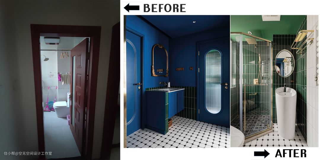 【卫生间改造前和改造后对比】 改造前卫生间没有干湿分区,就是洗漱马桶淋浴集中的空间。改造后,洗漱区域外移在卫生间外面,这样早晨上班有人上厕所或者洗澡,跟外面洗漱空间不影响。改造前卫生间内部没有干湿分区,淋浴的时候水会往四处溅,进门就看到了马桶,私密性不高。改造后,同样满足这三个功能,淋浴房采用了钻石型,马桶则改到了左侧区域,马桶做成了壁挂马桶,方便打理。 卫生间的干区和通往主卧和次卧的过道空间,将这两个空间的集中到了一起,让整个空间更加的宽敞。地面则采用了黑白色小花砖,本身整个区域属于一个暗的区域,所以地面采用了比较亮的颜色,浴室柜也做了壁挂的设计,方便后期打理。墙面颜色则采用了蓝色,主卧,次卧,卫生间的门则都选择了同色系的蓝色。金色的镜子让整个空间更加的复古,轻奢。 原来的卫生间空间,我们往里缩了一些,地面依旧跟干区的地面采用了一样的黑白花砖,然后墙面则采用绿色长方形砖竖铺,金色五金件和淋浴房都将整个空间提高了质感。淋浴花洒也做了预埋的设计,而这块区域也增加了洗漱功能,采用了柱盆,满足日常早起需要双洗漱空间。