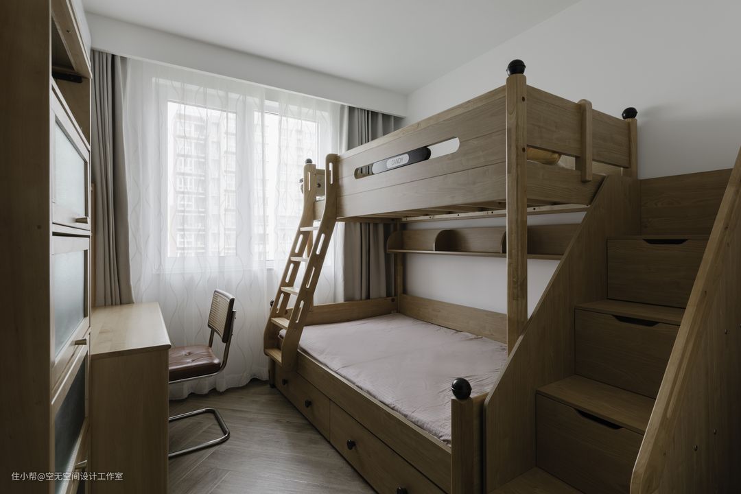 【书房/多功能房改造前和改造后对比】 改造前就是一个标准的次卧空间,但业主需要办理空间,书比较多,还有满足以后有小孩,父母偶尔过来的情况。所以改造后的次卧是一个多功能的房间,既是书房,又是儿童房,又是次卧的功能。 由于书比较多,这是读书办公学习的空间,书柜也采用了成品家具,便于后期的移动和变化。书柜是有玻璃门,平时可以关上,也可以打开折叠到里面。拿书也比较方便,也比较方便打理卫生。右侧则放置了学习办公桌,左侧的抽屉柜可以放一些日常的文件等,上面也放置了一个格子,方便可以放一些其他的东西。 上下铺满足了多功能的需求,老人来了也可以住,平时上铺可以做一些储物,楼梯则也采用了爬梯和踏步楼梯双方式,踏步楼梯下面可以放一些衣服收纳。未来这个屋可以直接变成儿童房,儿童学习睡觉的地方,玩耍更多的在客厅区域。