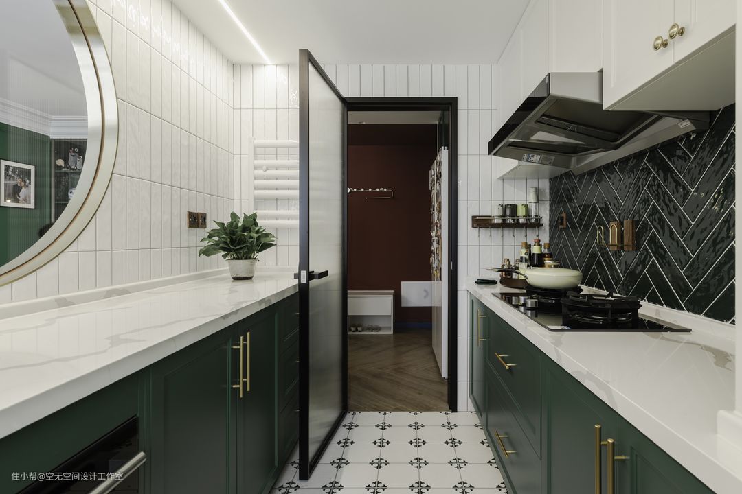 【厨房改造前和改造后对比】 改造前厨房是一字型的橱柜空间,中间空间也比较狭窄,整个厨房空间也比较灰暗。改造后橱柜变成了U型的橱柜,然后厨房的墙面采用了白色瓷砖,下面采用了绿色橱柜,地面也是采用了花砖,让整个空间变的比较明亮。 改造前厨房的门是在客厅背景墙,改造后厨房入口改到了玄关进来的区域,动线更加的方便便捷,从而实现大U型橱柜,充分利用厨房空间,满足2-3人的做饭需求。打开厨房门,满满的大自然的感觉,整个厨房采用了白色和绿色搭配。让厨房的空间比较干净清爽,在窗户旁边放置了微波炉和烤箱的置物架。大大的u型台面,满足经常做饭,对厨房高要求的需求。金属的把手也让橱柜增加了一丝轻奢复古的感觉。