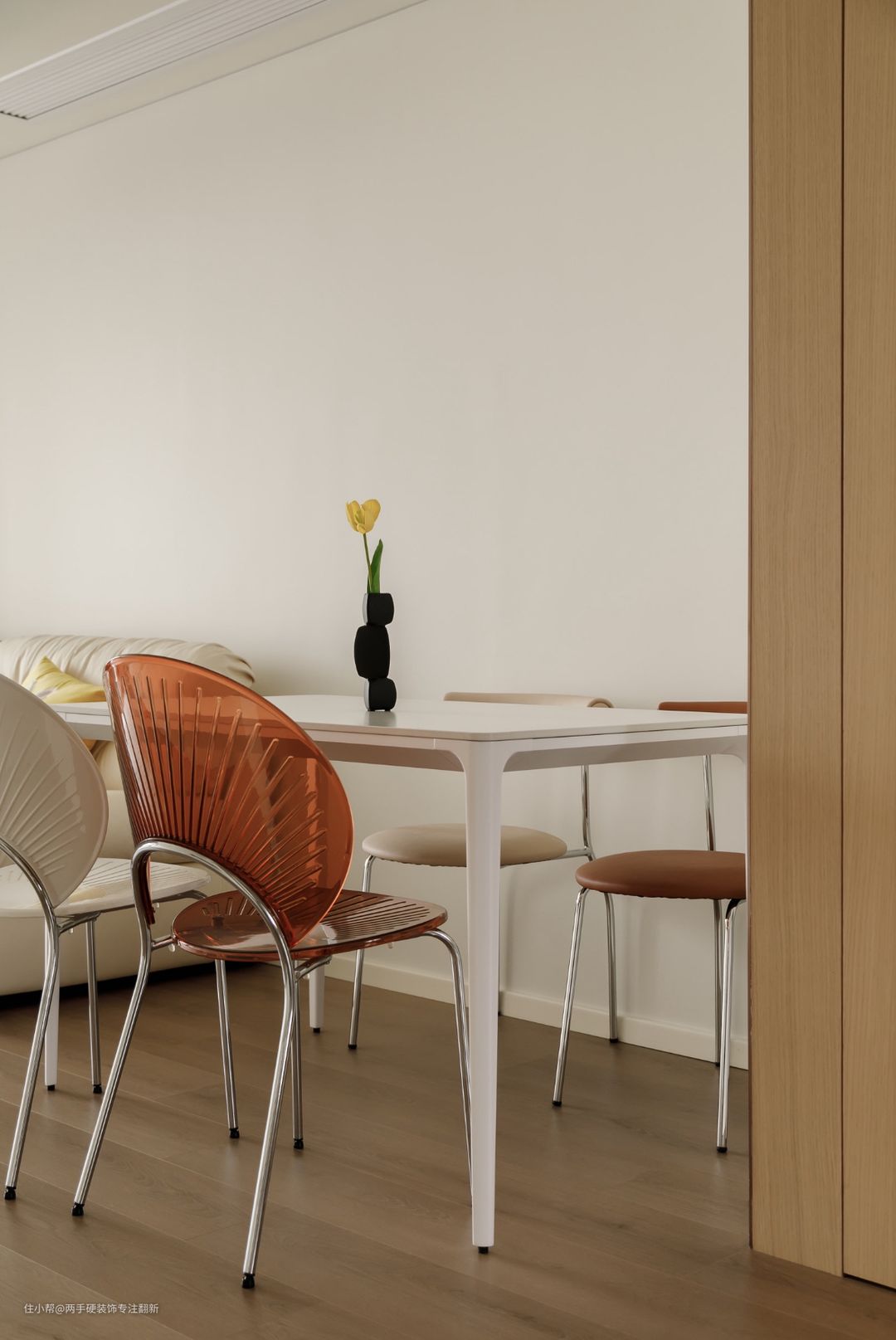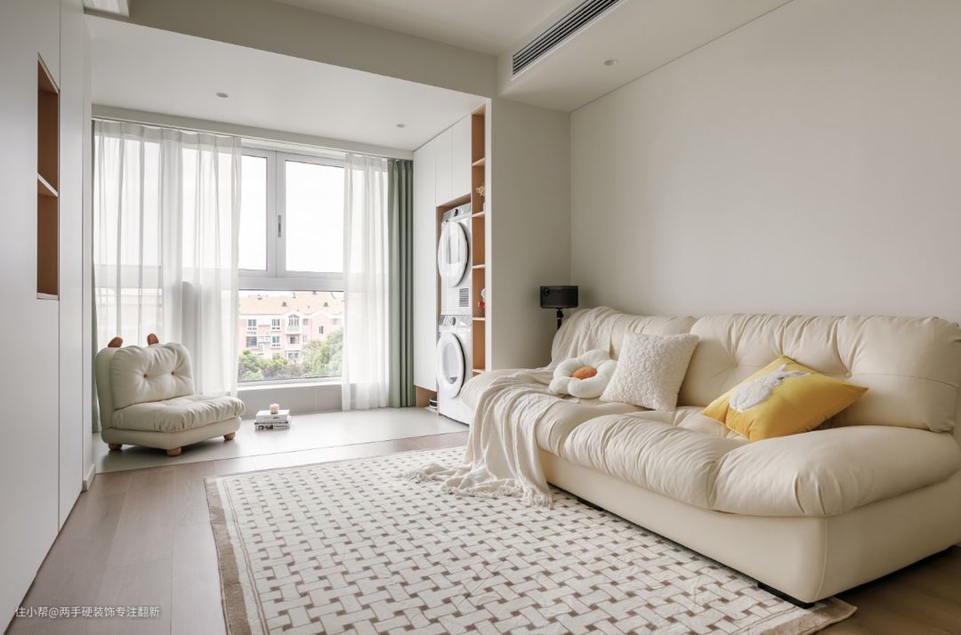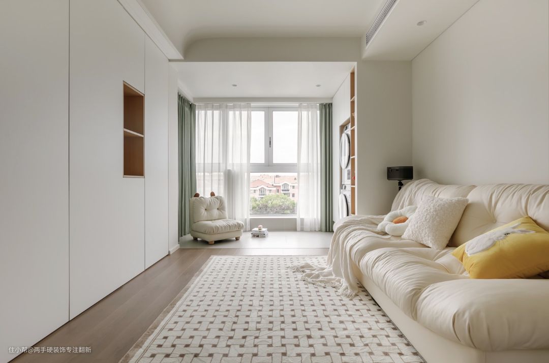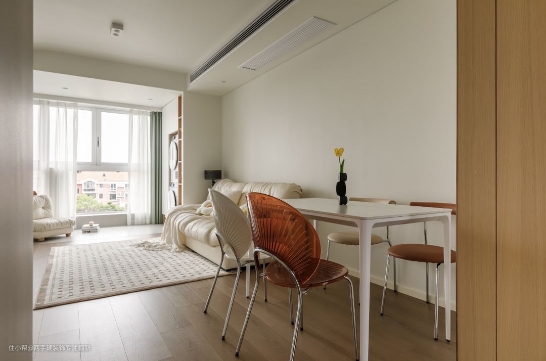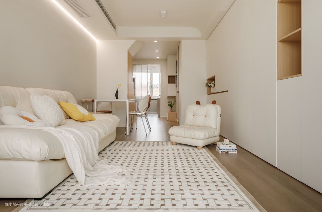 改造前的空间是老旧的猪肝红,改造后客厅以奶白色作为主基调,墙顶一体同色弱化了边界感,营造出慵懒舒适又放松的空间感觉,顶面保留原始层高,安装明装射灯让空间看起来更干净显大,沙发背景线性灯作为氛围灯贯穿客餐厅,增加灯光层次。