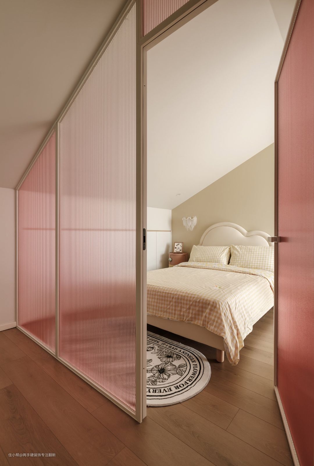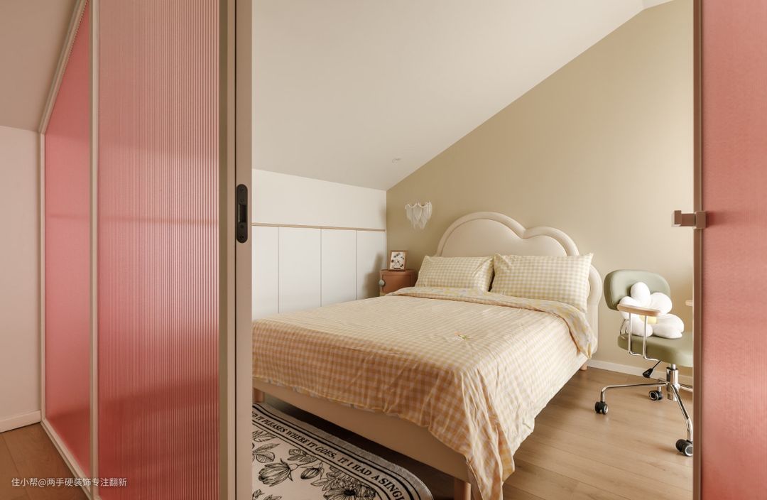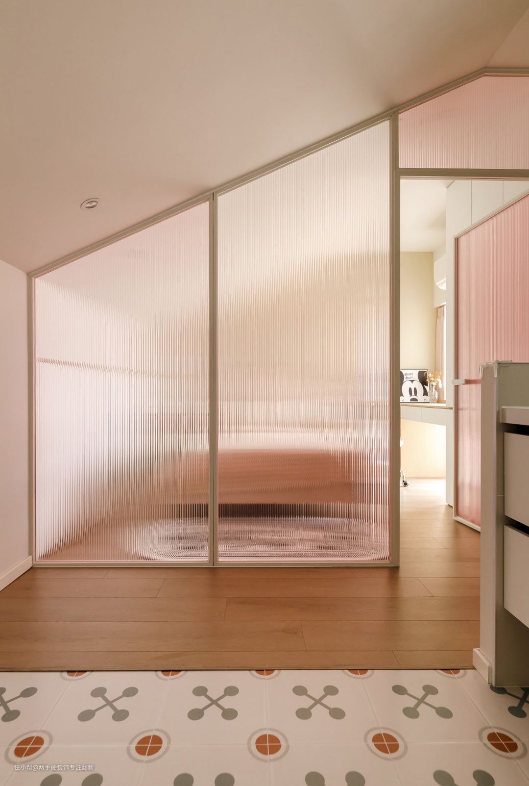 二楼女儿房区域,采用彩色渐变长虹玻璃隔断,划分卧室空间,粉色玻璃符合女孩房的整体调性。玻璃隔断优势在于可保证外部空间采光不受影响。