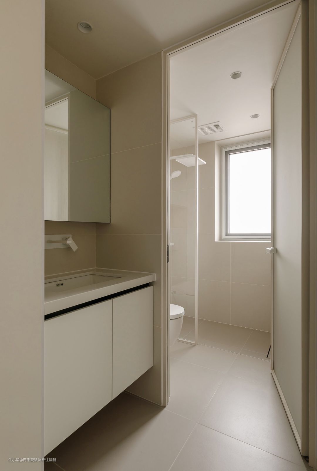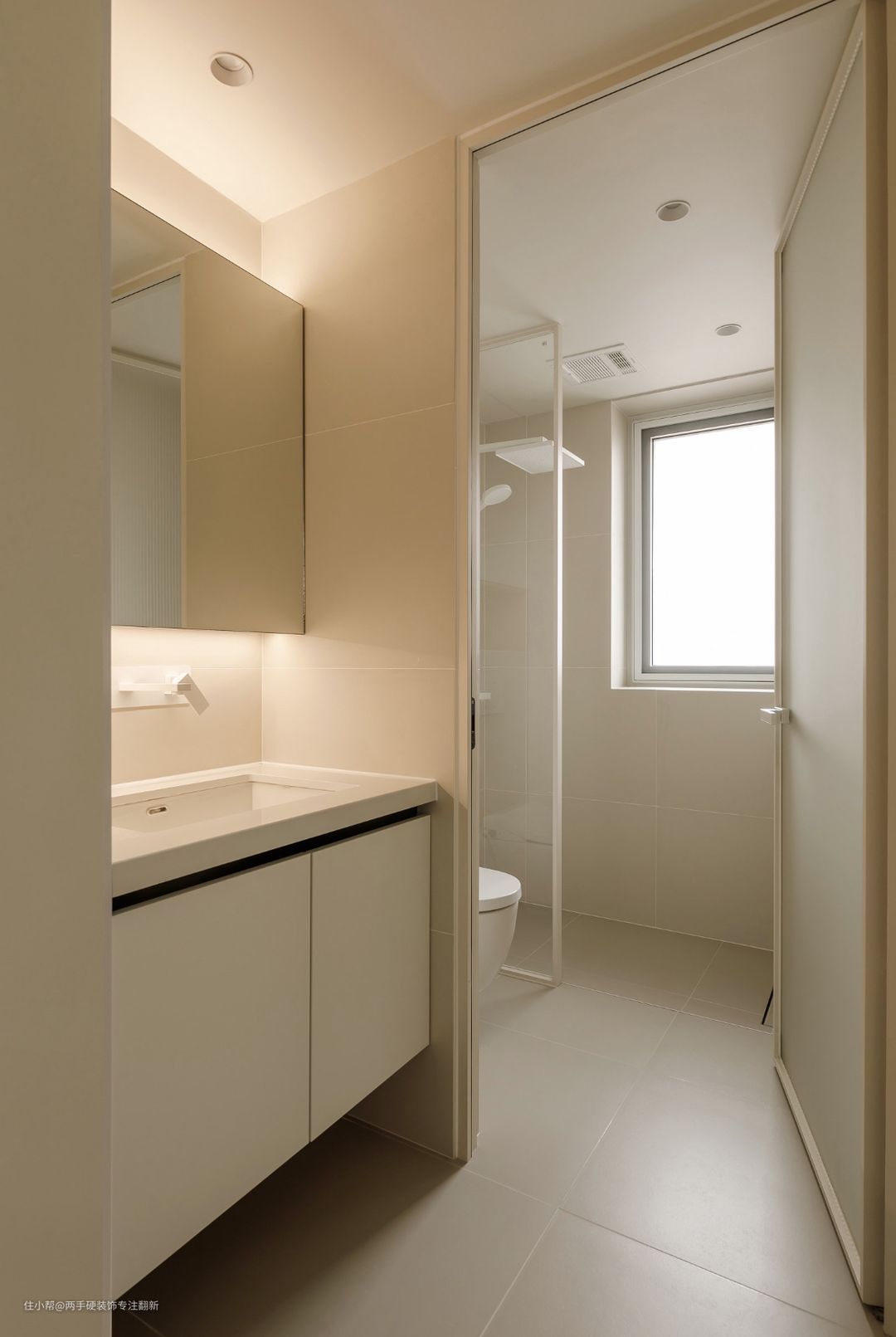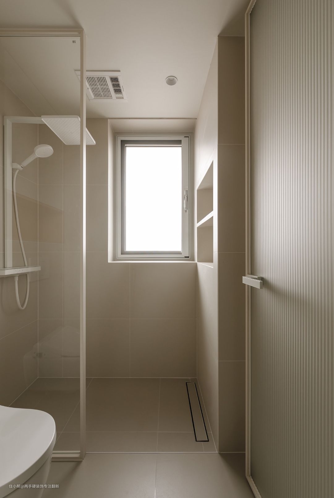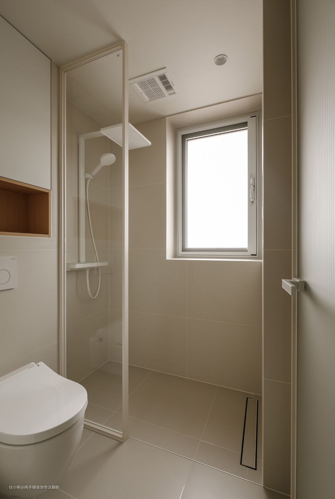 卫生间整体色调延续奶油色的感觉,马桶与淋浴区使用玻璃隔断,保证小空间内的采光通透性,淋浴区对面设计了双层壁龛空间,用于摆放沐浴用品。