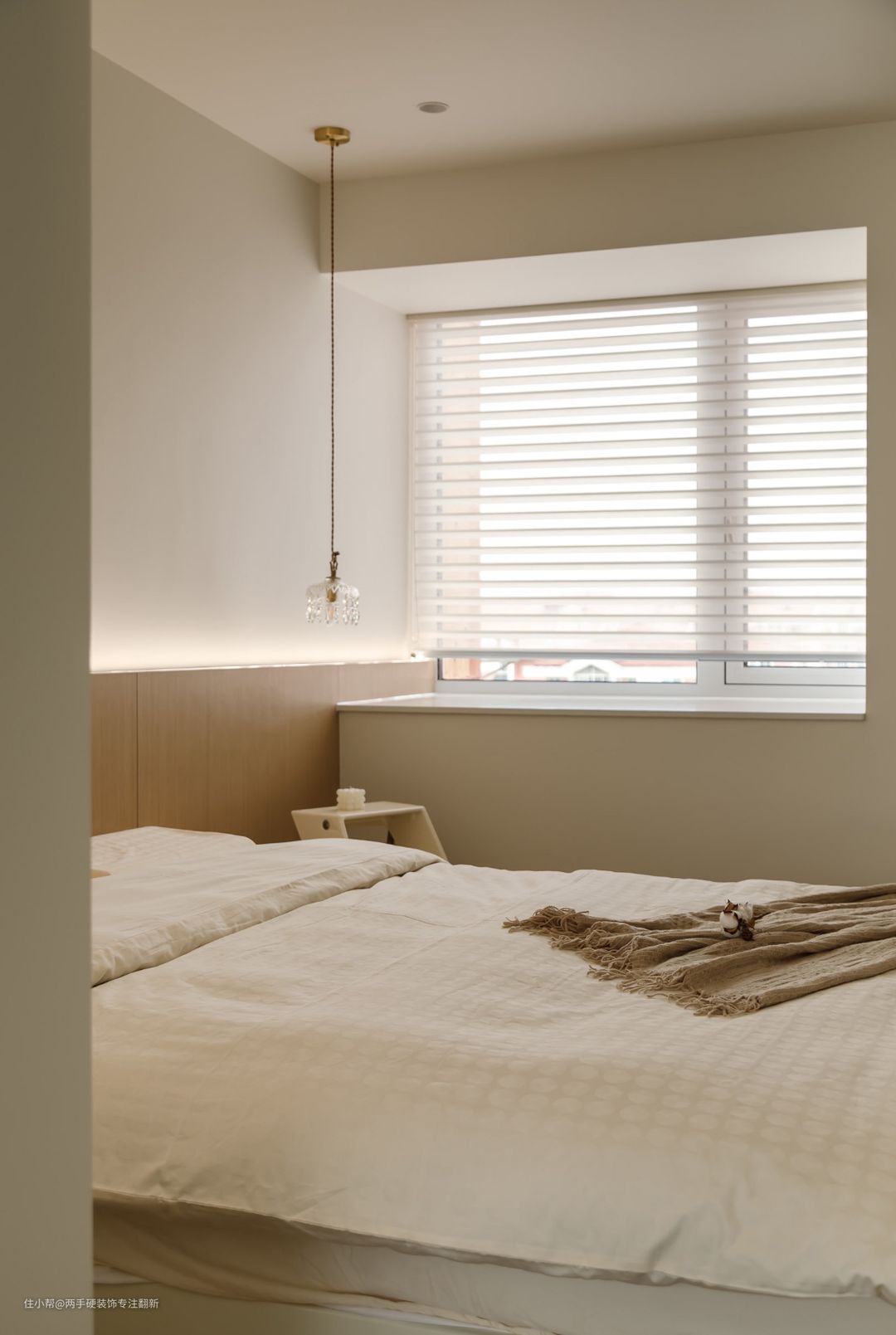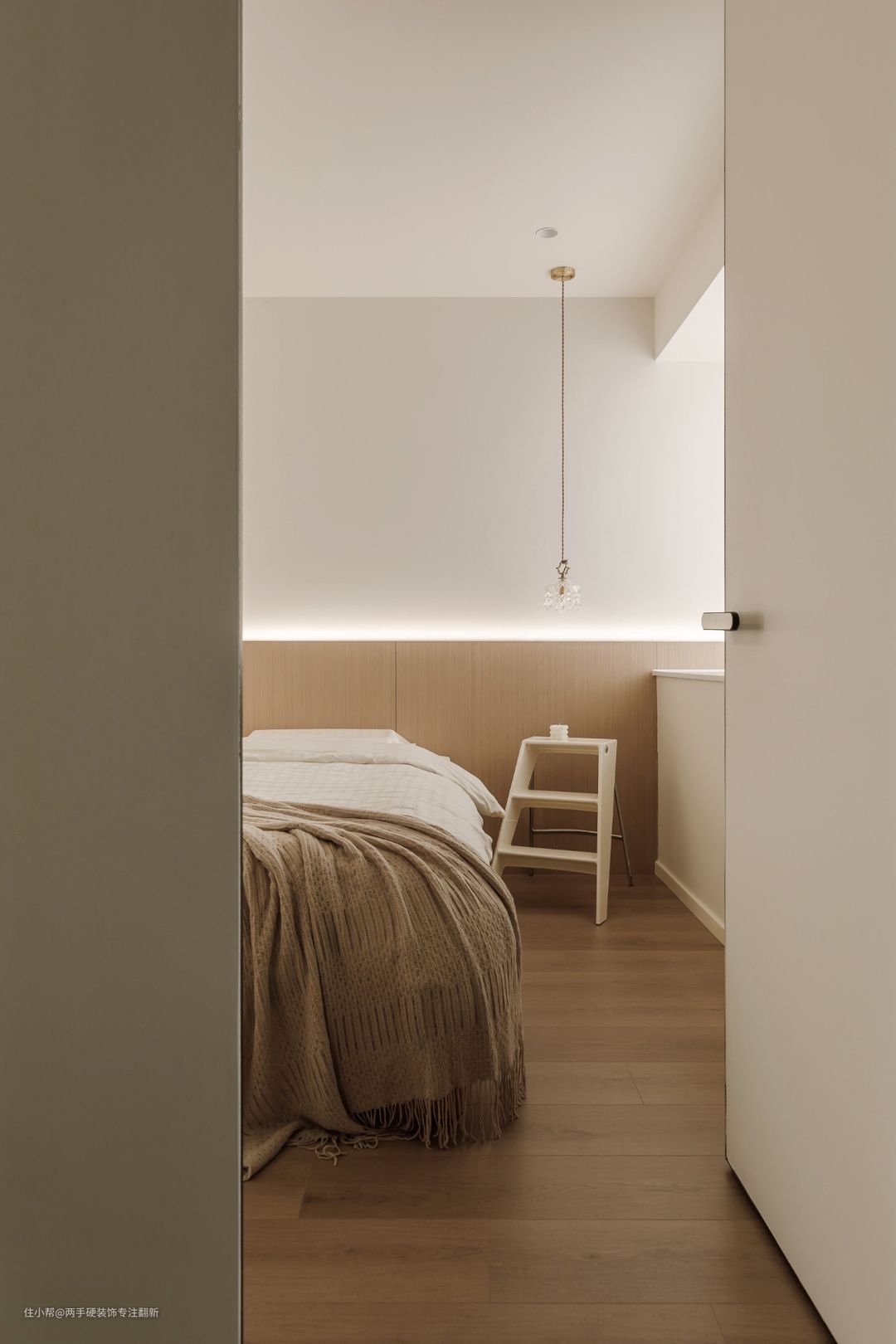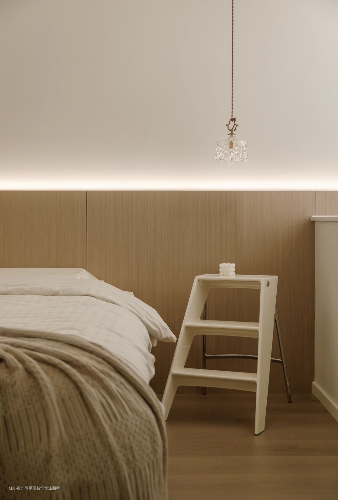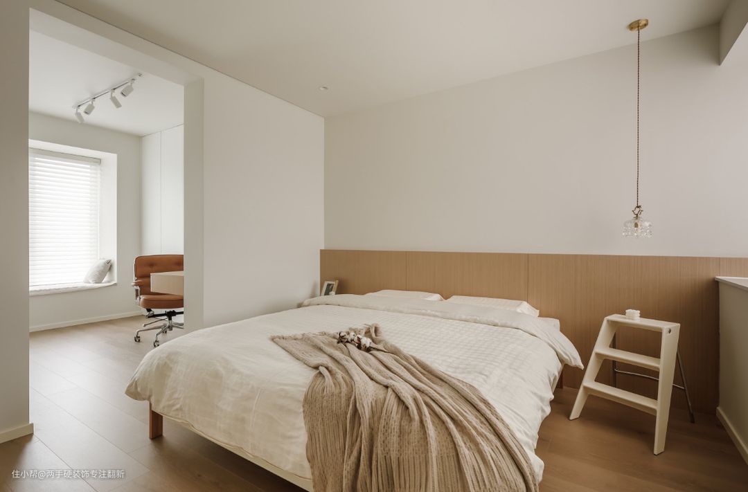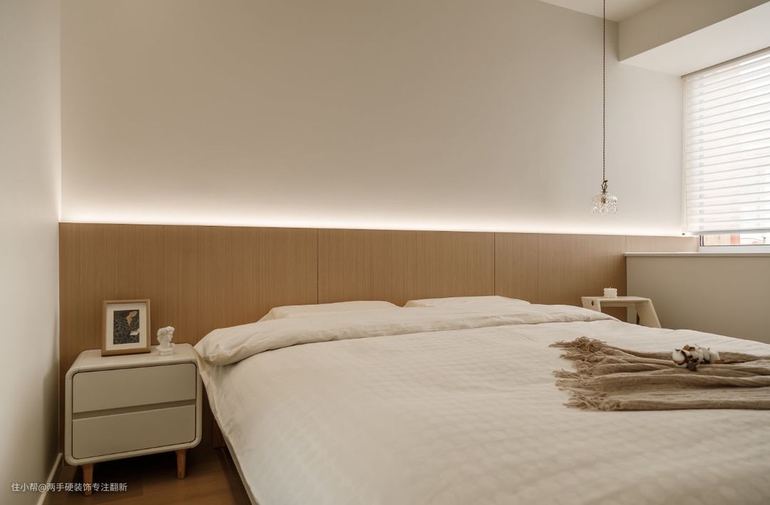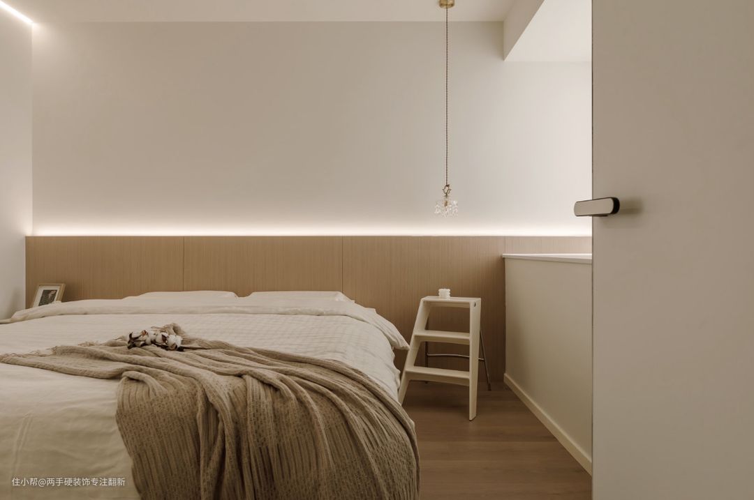 卧室选择了没有靠背的悬浮床,床头背景采用木饰面与灯带相结合,营造出空间氛围感,床头的小吊灯让大面积留白的卧室不显单调。