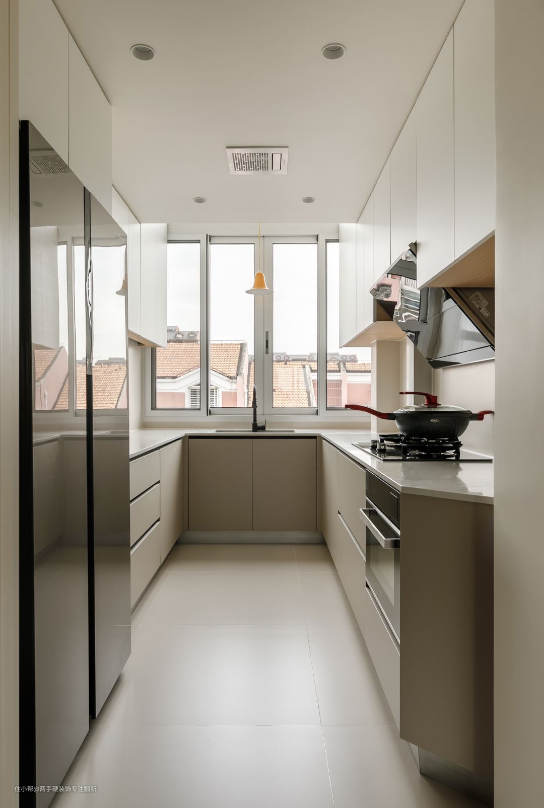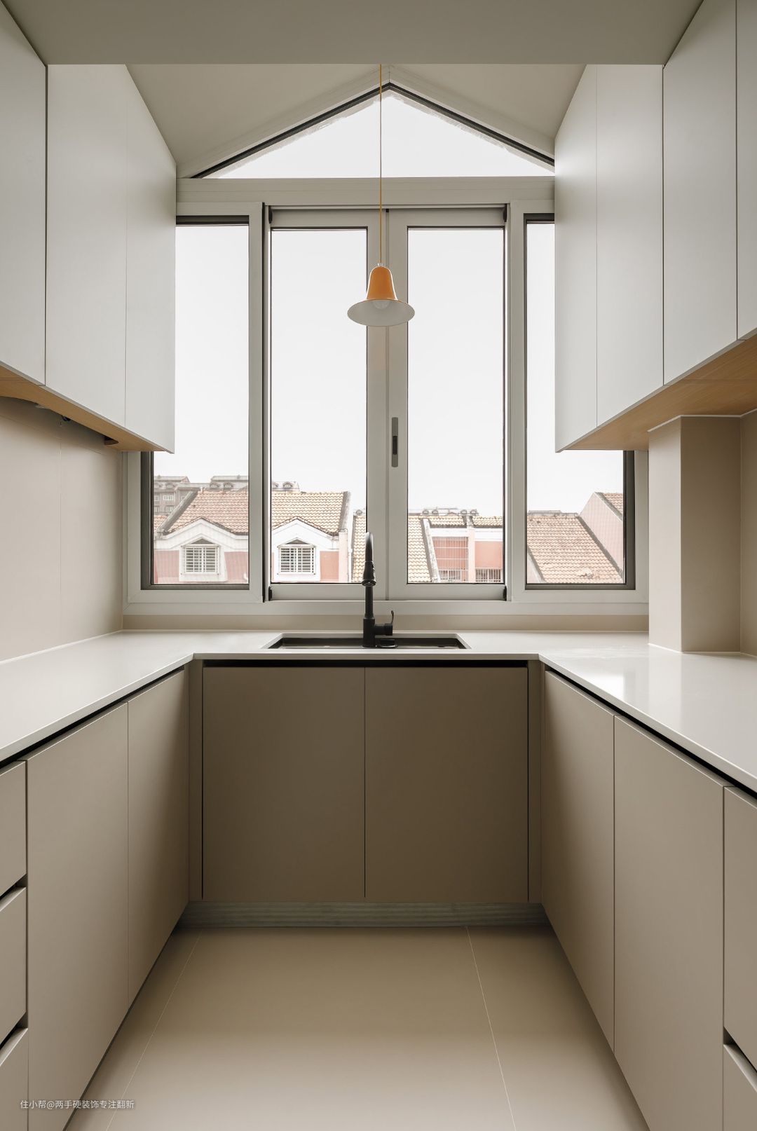 实用厨房是业主提出的需求,6.5米的整体橱柜U型布局,柜门采用上浅下深高级耐看,拉手使用U型内嵌拉手,外观简洁不会破坏橱柜的整体性,还能减少磕碰。台面选择纯白色石英石,无后挡水,无下挂视觉上更简洁。