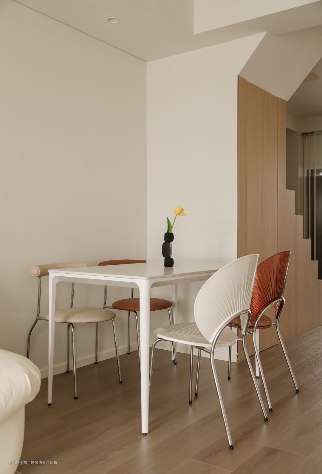 用时的舒适性。 ②重新设计后的L型楼梯,与餐厅互不影响,楼梯下方作为家庭储物间使用。