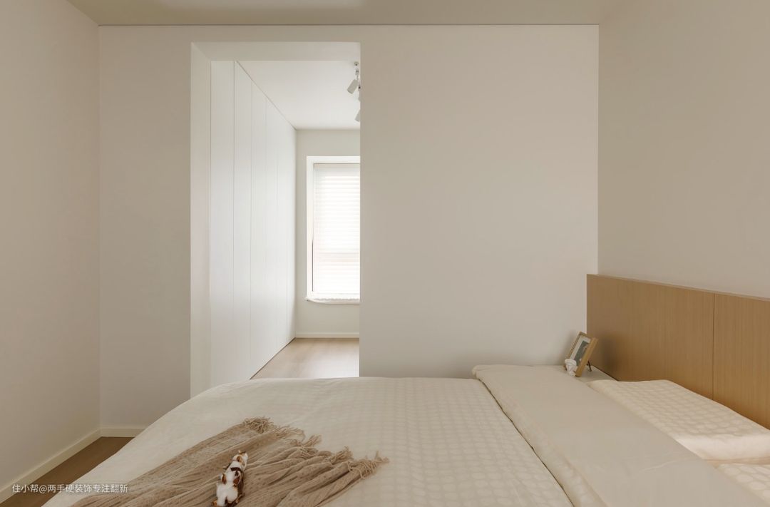 虚实相生,适度留白是我对于这间卧室的理解,抛弃过多繁琐的装饰,符合现代人期待空间设计能够满足在高压力生活状态下获取适度松弛感的情感需求。