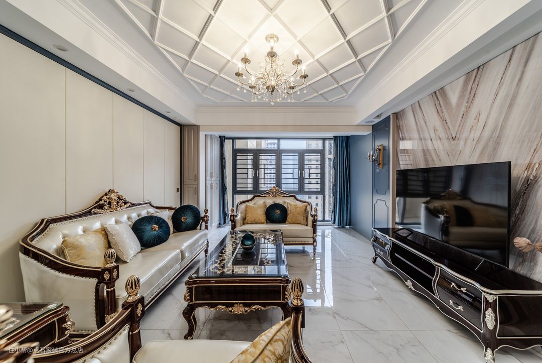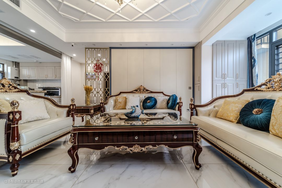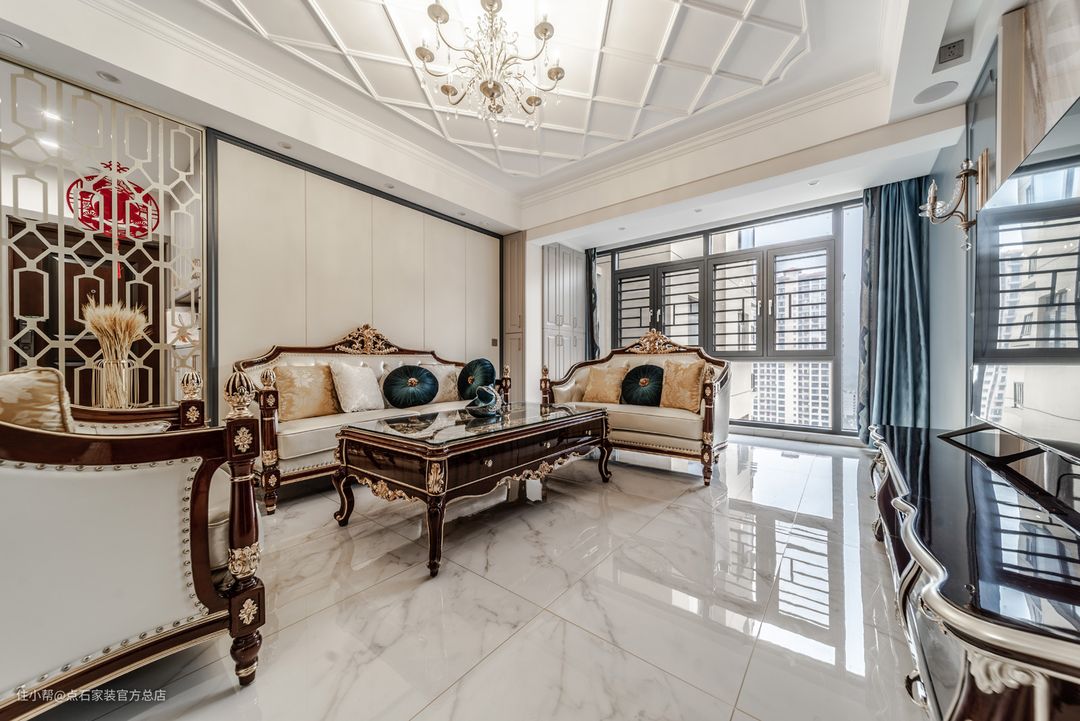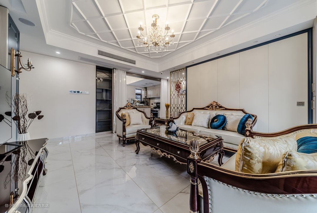 客厅区域,整体体现出了大气磅礴的气质与感觉!视觉上吊顶采用了菱形线条设计突出了灯光的视觉中。并且在家具造型上采用了以美式元素为主的风格调性。