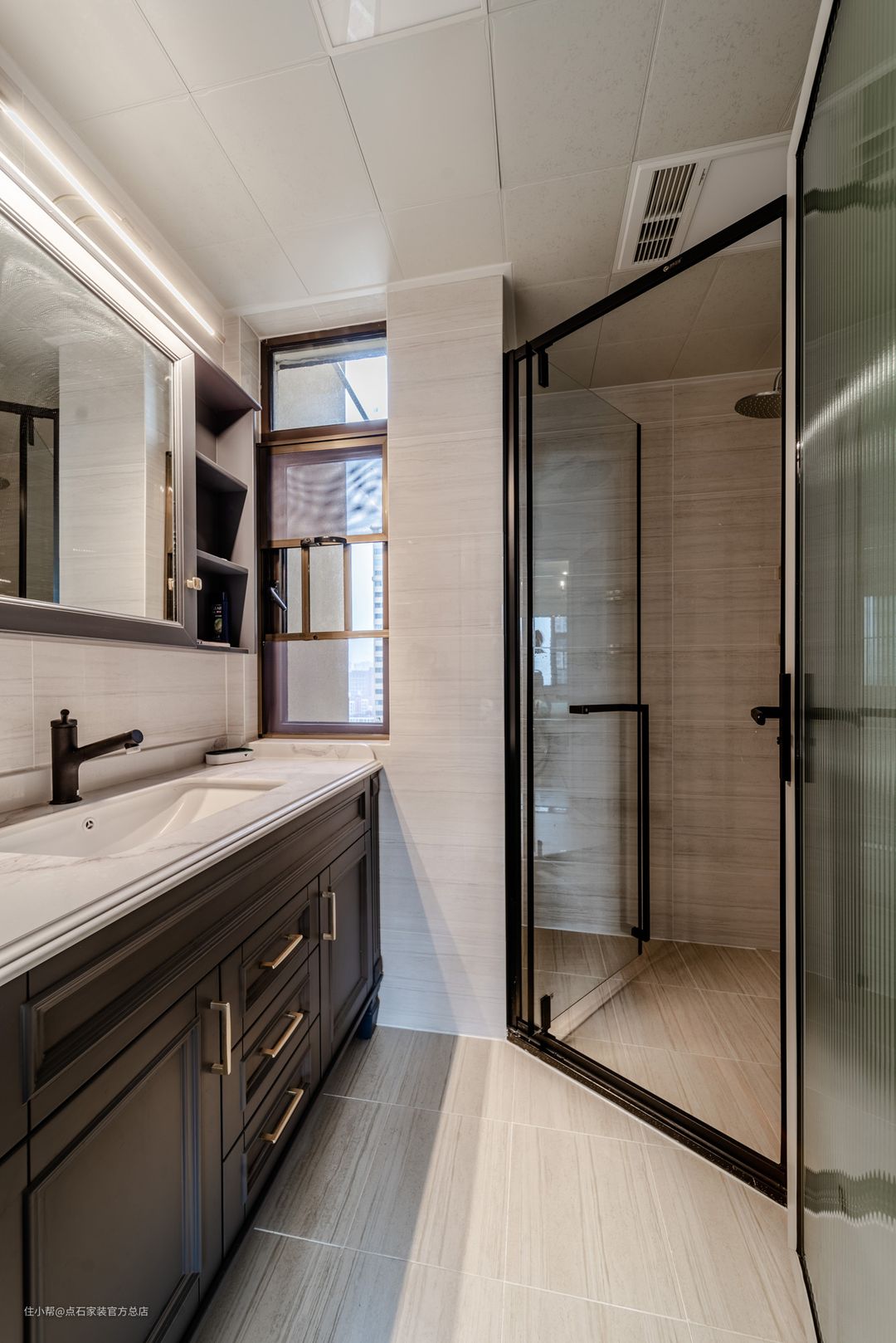 卫生间区域,整体以灰黑视觉为主,再加金属元素,凸显了一丝轻奢的质感。并且用淋浴房的形式做了干湿分离,来区分这个空间。
