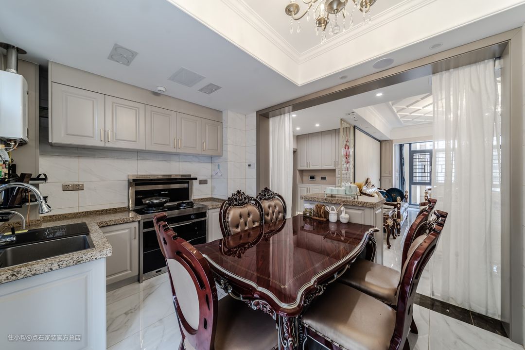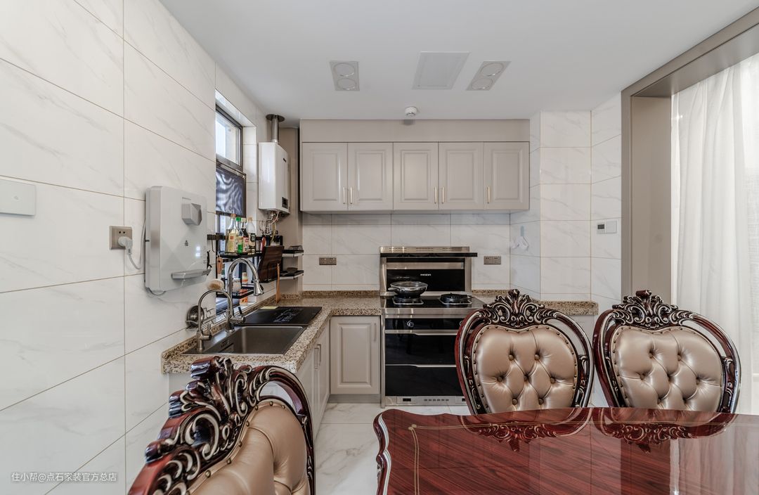 餐厨区域,餐厨区域格局上一体。在家具软装风格搭配上,保持了和客厅一致的风格!在设计上也采用了嵌入式设计,将集成灶和洗碗机集合到了一起,来保证厨房空间的合理利用。