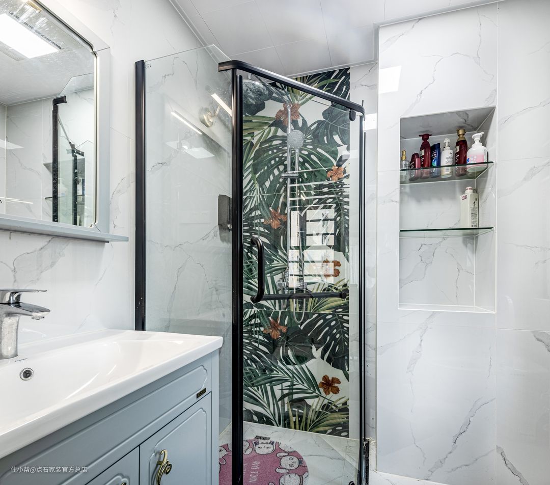卫生间,利用淋浴隔断做了干湿分离。洗手台的颜色与家中的柜子的颜色相呼应,另外也利用墙面的空间做了壁龛,来放置洗浴用品,让整个空间更加简洁、干净。