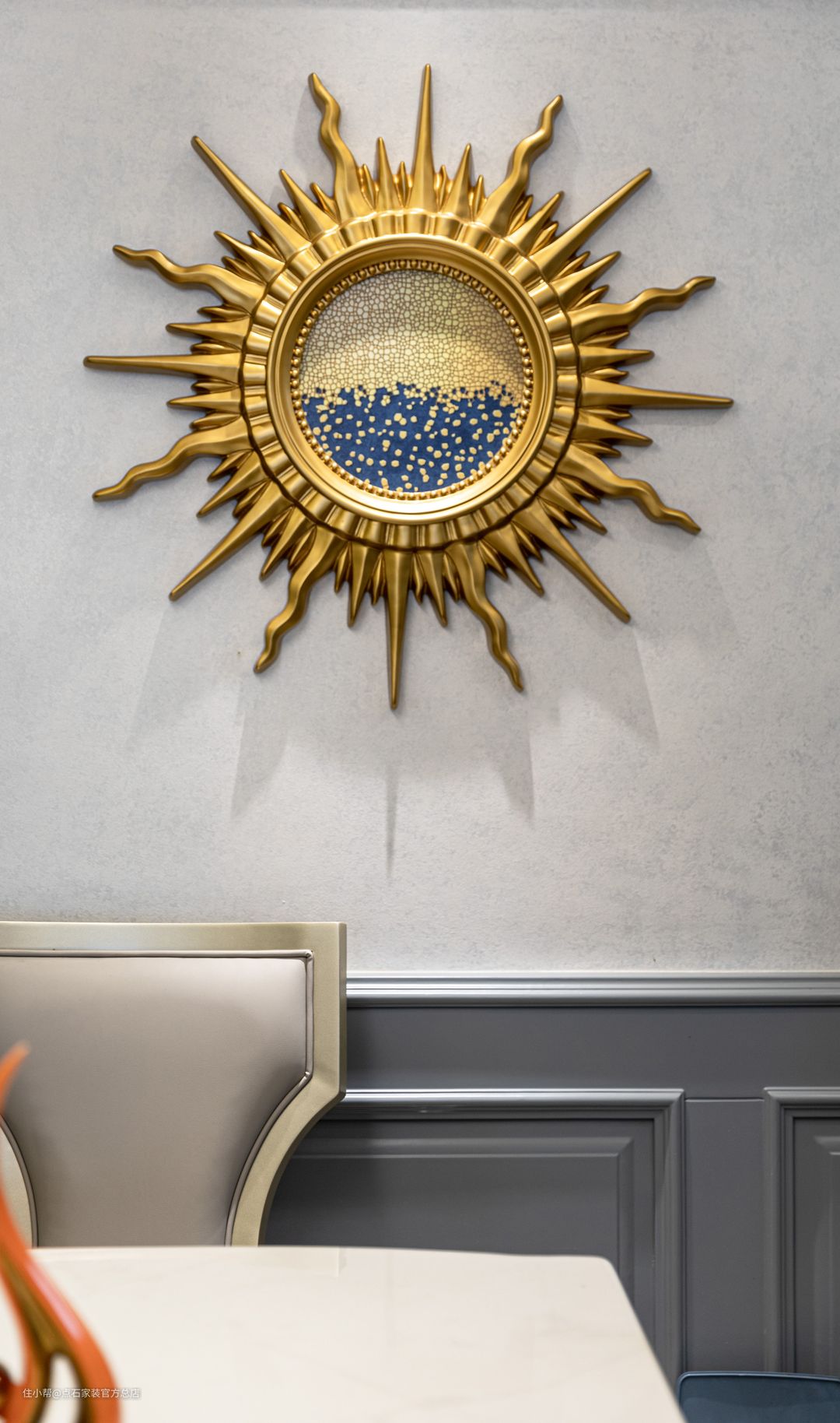餐厅,用欧式太阳元素作为主视觉,餐桌椅选用米色,和墙面的白色为一个色系之内,来保持空间的整体色调搭配。旁边的淡蓝色餐边柜则满足了客餐厅的收纳。