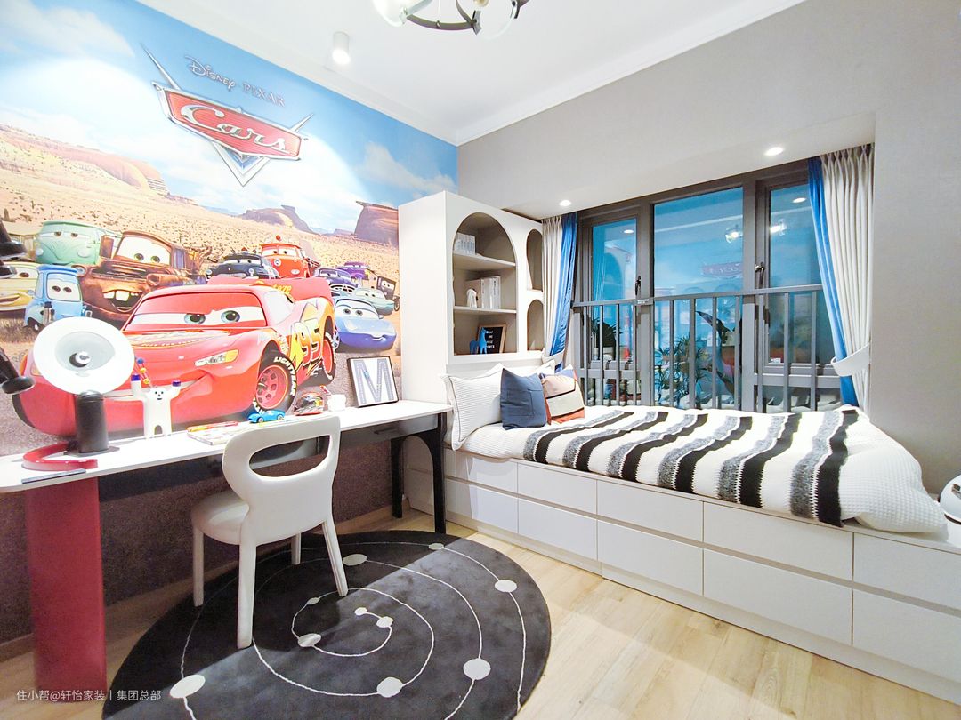 儿童房根据小朋友身高打造床尾收纳柜,方便孩子存放书籍和玩具。儿童房的地板选择了用木地板通铺,木地板以天然木材为主,具有吸湿与解吸功能,可以有效缓和室内温湿度,让居室尽可能保持在最适宜的温湿度中,舒适怡人。而且相比其它地面材料,木地板的弹性更大、触感细腻又温润,且摩擦系数适中,可以缓和孩子双脚的重量负荷,给予脚部更好的呵护,亦不用担心地面太滑而容易摔倒的问题,带给家人满满的安全感。一进门,出现在我们面前的是带着一股浓浓的少年感的空间。男孩房突破常规的传统设计,床的造型迎合男孩爱好进行定制,非常的青春四溢!白色学习桌整体造型清爽利落,黑钢细腿更显轻盈。墙面留白,可以依据孩子喜好自由布局,打造最优收纳方案。