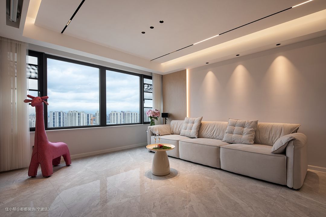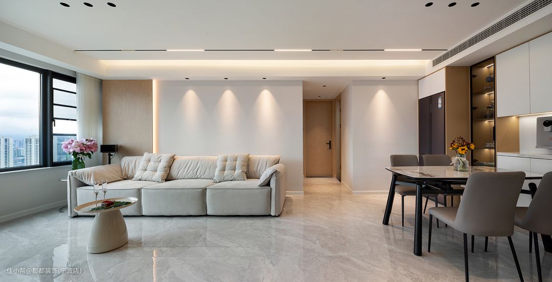 客厅采用大面积原木打造,给人自然大气的第一印象,完美诠释现代时尚生活方式,通透的大窗让室内与城市精致融合,通透而灵活,仿佛是一座悬与空中的光之岛。 好的灯光跟好的妆容一样,可以让普通空间变高级,提升居住体验,客厅采用线性灯光+射灯的引导,点亮入户区,隐喻着漫漫生活之趣。 电视墙采用温暖榆木做隐形背景,投影+幕布+隔板墙,在家轻松拥有影院效果。 沙发背景墙是1:2的原木、白墙拼接设计,米白色科技布沙发与木色背演绎出空间的脱俗和高级感。