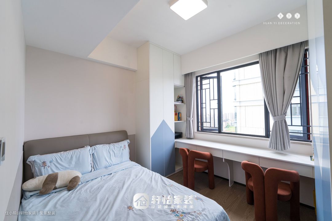 男孩房做边吊+吸顶灯,紧贴墙面摆放家居,取消床头柜,床头右侧是到顶的衣柜,连接衣柜定制孩子的学习书桌,书桌右侧依然是到顶的柜子,衣柜+书桌形成H型,充分利用空间且美观实用。 蓝+红撞色搭配,红色的热情+蓝色的冷静,动与静的结合,尽数展现屋主的个性鲜明有态度。 深灰色床品搭配浅灰色乳胶漆,深浅不一,展现空间的层次感。
