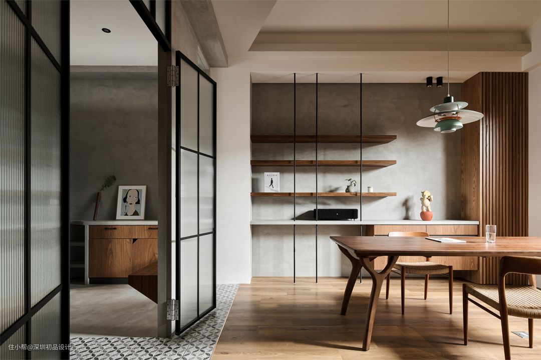 餐厅设计在二楼,同时也将厨房墙体拆除,空间做开放式设计。满足日常生活的仪式感,同时也保证了空间的通透性。原木餐桌和简约的木饰面餐边柜,以及原木置物架,大量定制的运用会让空间彰显出自然温润感