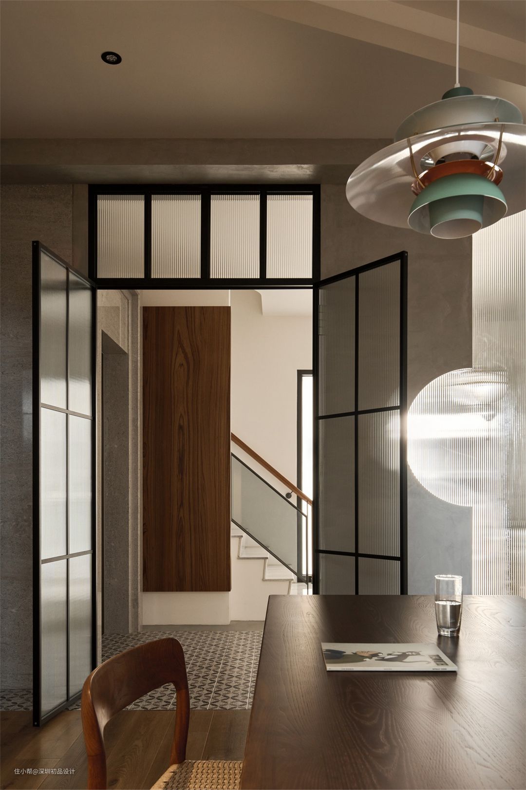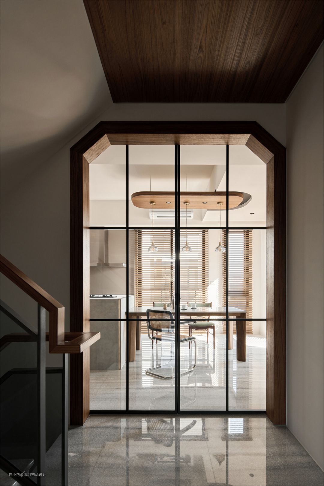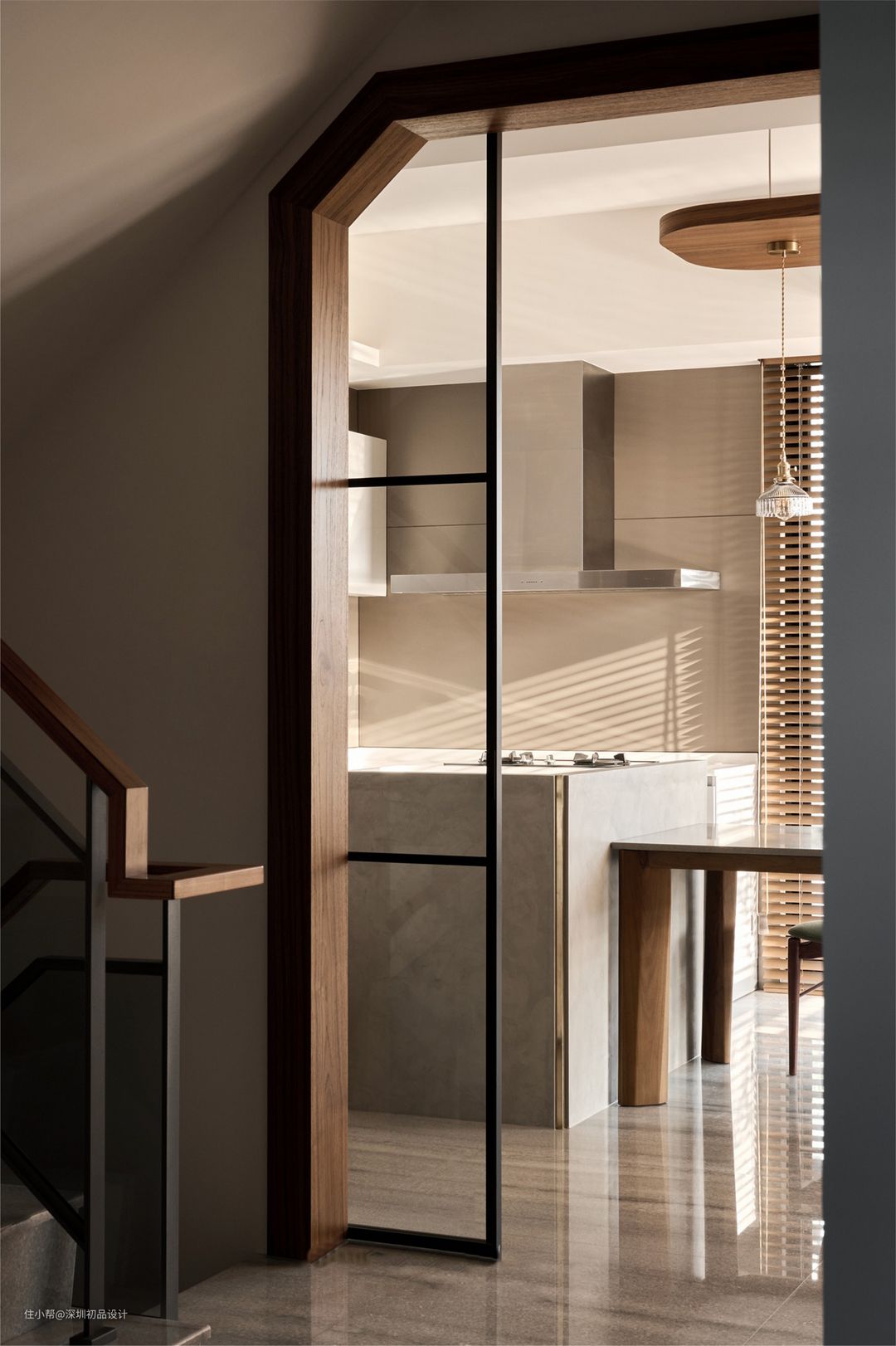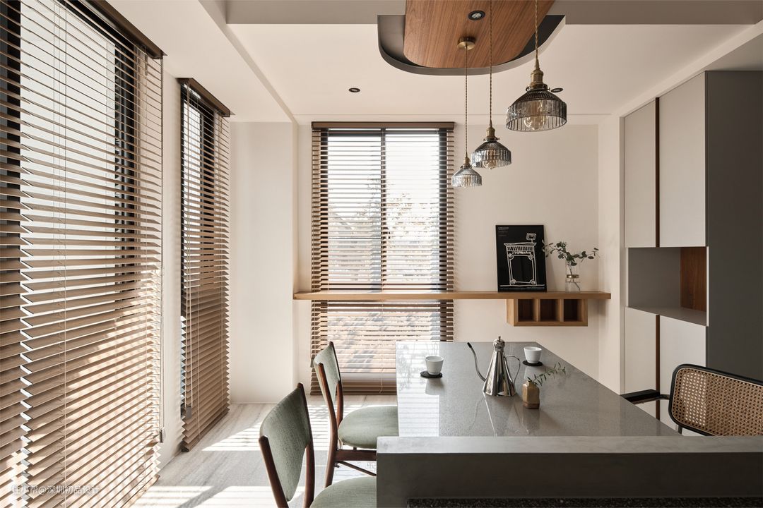 餐厅设计在二楼,同时也将厨房墙体拆除,空间做开放式设计。满足日常生活的仪式感,同时也保证了空间的通透性。原木餐桌和简约的木饰面餐边柜,以及原木置物架,大量定制的运用会让空间彰显出自然温润感