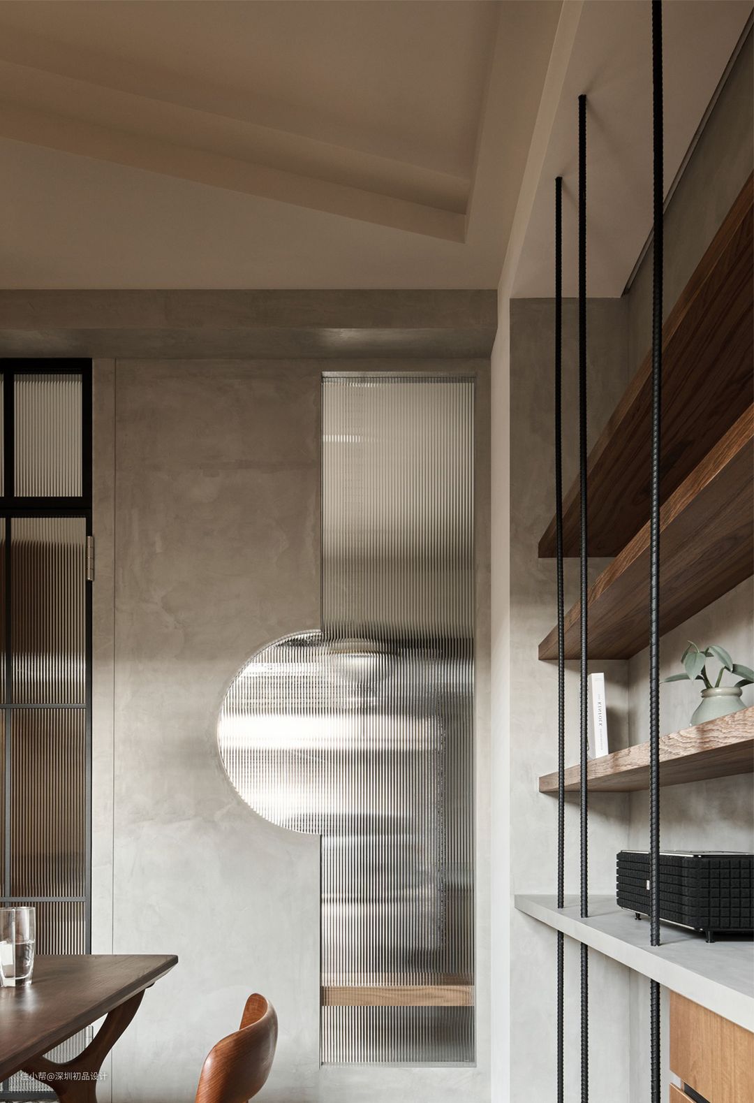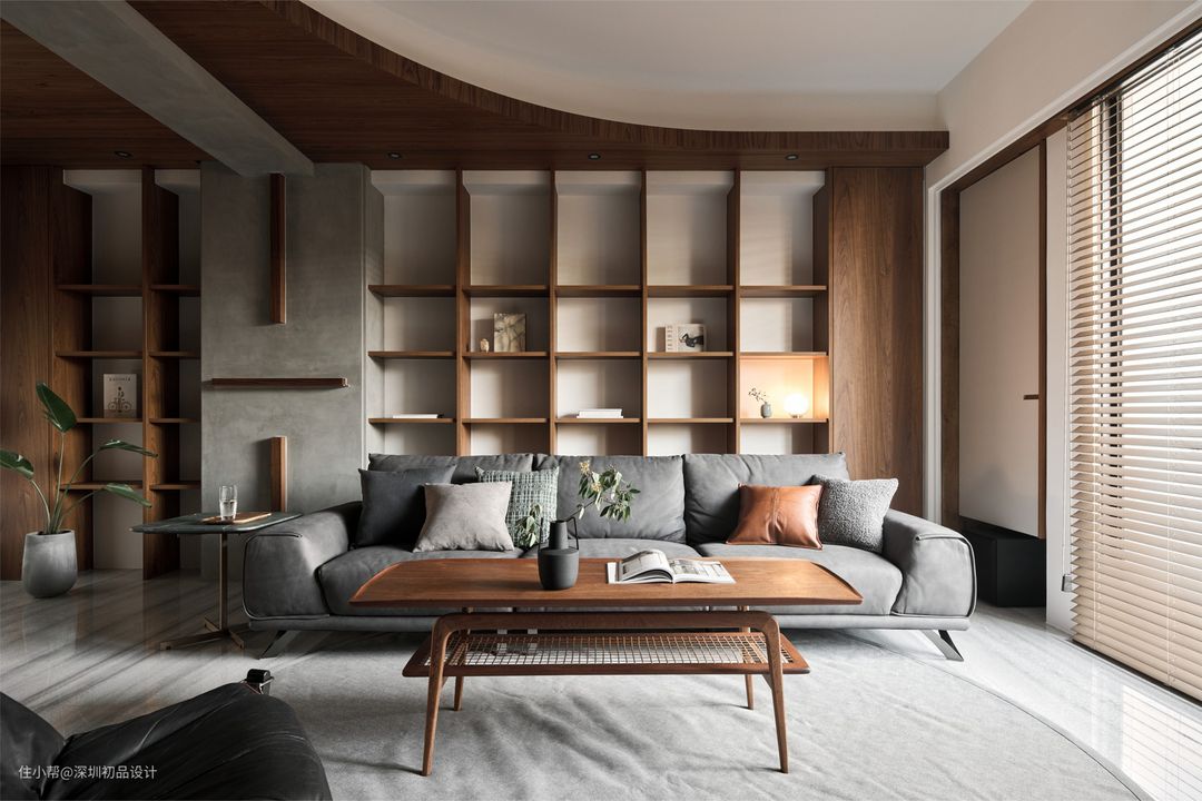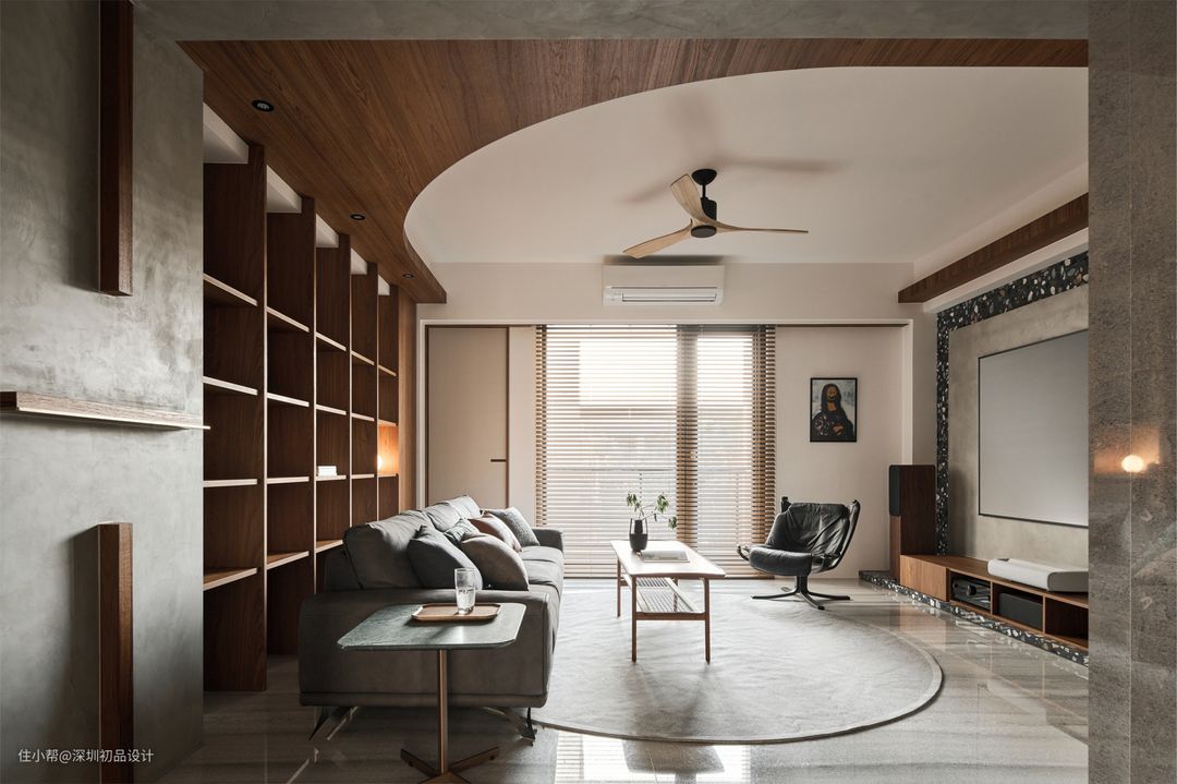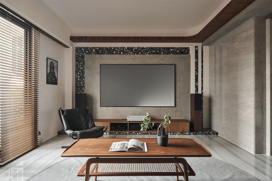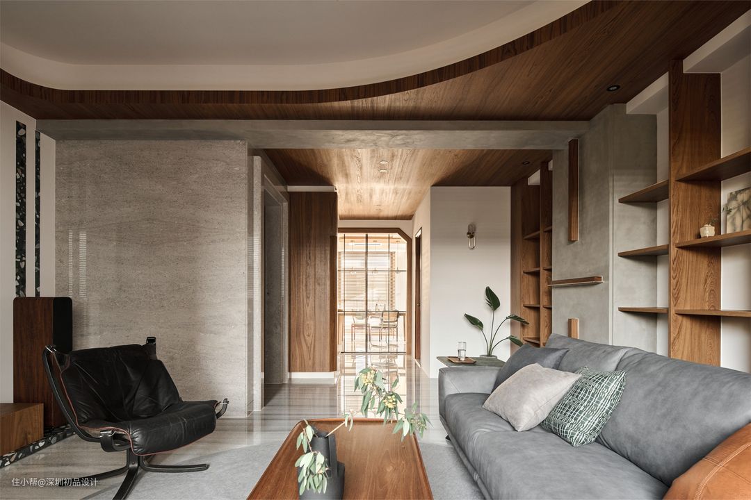 客厅整体以现代简约风为主线,借助与木质纹理、微水泥和石材质感碰撞后的明暗反差,展现稳定而轻松、纯粹而温暖的空间氛围。空间以木色和浅灰色系为主,穿插深色系点缀,通过线条和平面的修饰,更显现代主义的艺术格调。客厅沙发背景墙简单的开放格设计,硬包满足基础收纳又能彰显业主的生活品味。小面积的木色与灰色软装相辅相成,客厅的相容使整体空间更加宽敞通透